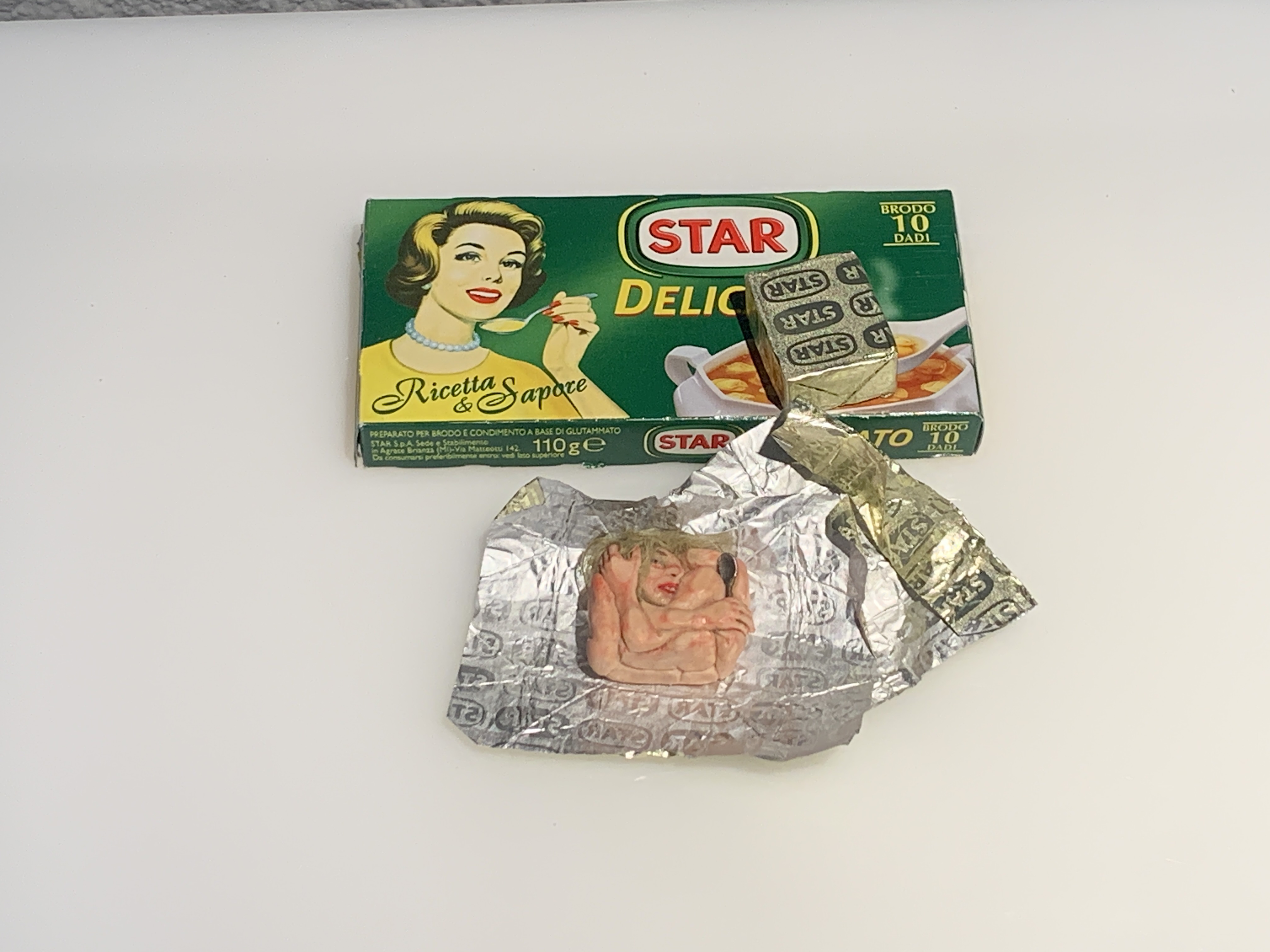 껌의 패키지가 보이고 껌종이 안에 사람이 구겨져서 들어가 있다. 사람을 현실적이게 너무 잘 표현해서 기괴해 보였다. 그리고 내 추측이지만 저 패키지의 여성분과 안에 껌은박지 안에 들어간 사람이 동일인물이 아닐까..라고 추측해 본다. 금발의 머리, 빨간 입술, 들고 있는 수저가 비슷해 보이기 때문이다. 이 작품의 제목은 역설적이게도 <I wished>였다.