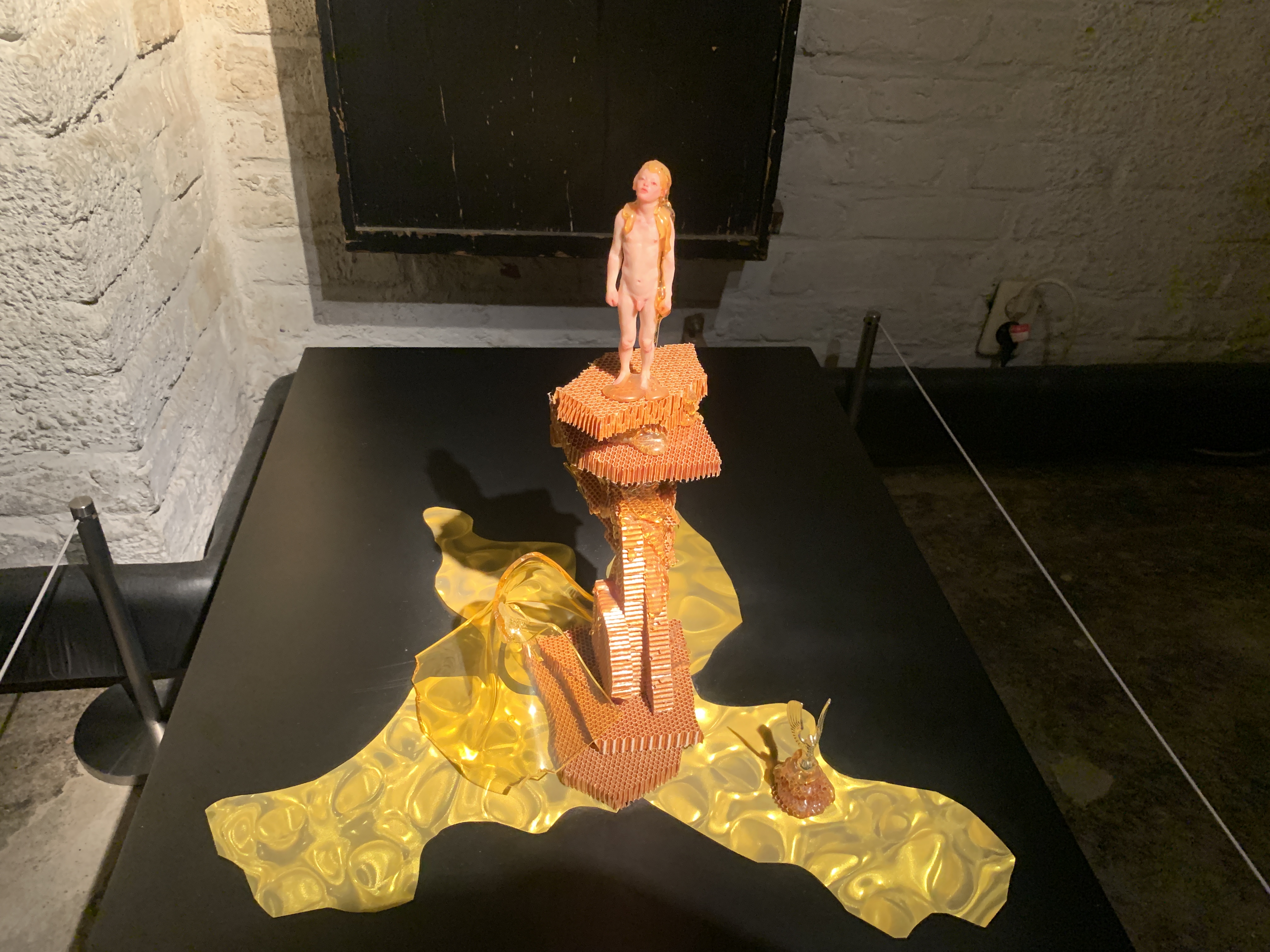 굉장히 정교하게 사람처럼 만들어진 조형물을 기괴하게 사물과 배치해 뒀다.