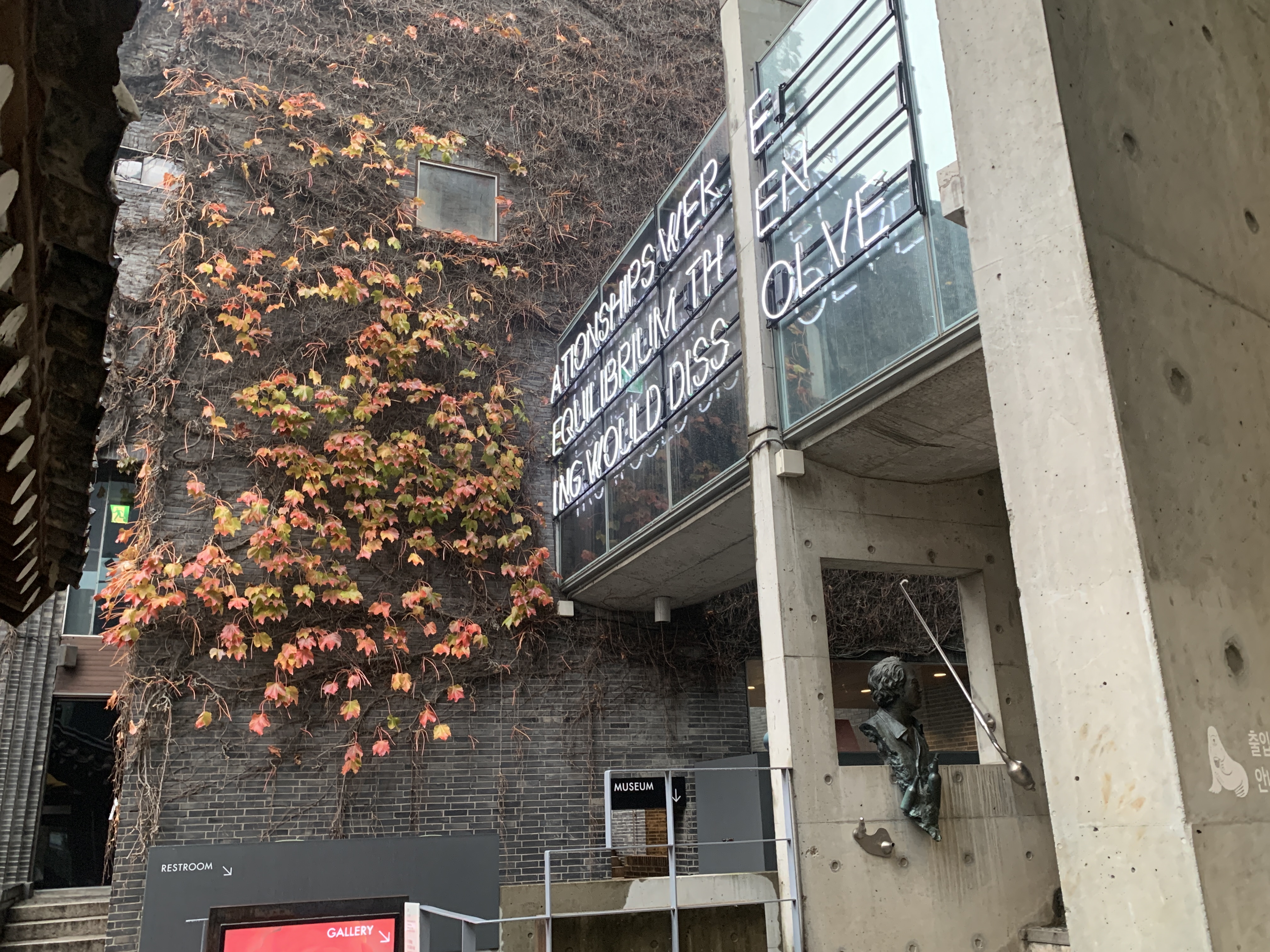5시 20분쯤 나왔는데 겨울이 다가와서 그런지 어두 컴컴하다. 그래도 밤에 보는 느낌의 건물은 또 다르다. 항상 하얀 벽에 걸려있는 작품들만 보다가 오래된 벽돌, 콘크리트 위에 있는 작품들을 보니 좋았다. 오히려 작품에 더 집중이 되는 느낌이랄까. 그리고 어떻게 건축물을 살려서 미술관으로 리모델링했는지를 찾아보면서 전시를 보는 것도 새로운 경험이었다. 이 미술관은 10세 이하의 어린이는 입장이 어려운데, 들어가 보면 작품들이 아무런 펜스 없어 놓여있고 공간자체도 위험한 부분들이 많아서 그건 충분히 이해가 되었다. 그리고 서울에서 웬만한 전시관들은 사람들이 많아서 조용하게 작품을 감상하기 힘든데 여기는 사람이 많이 없어서 조용히 생각도 많이 하면서 작품을 볼 수 있어서 정말 좋았다.