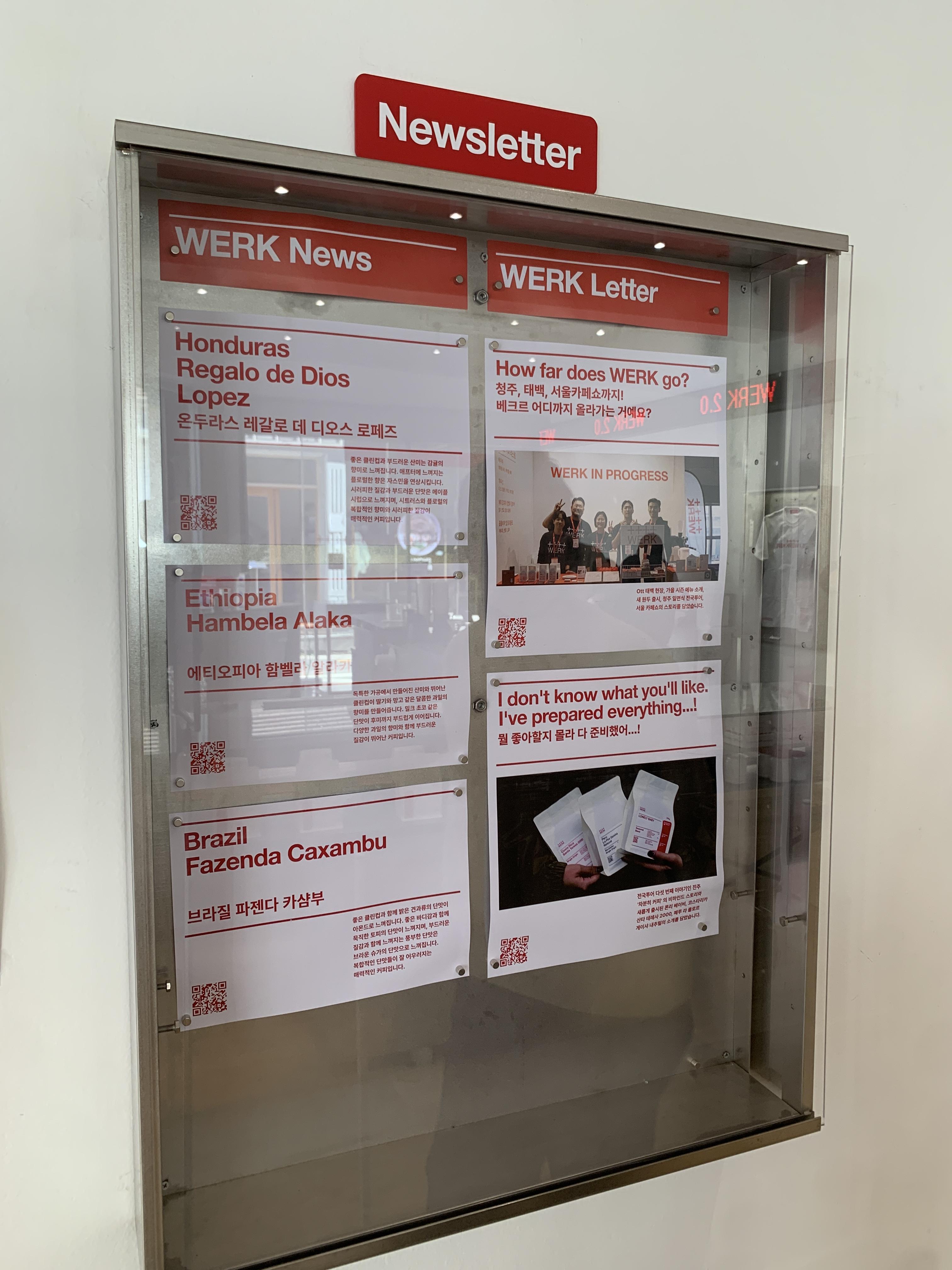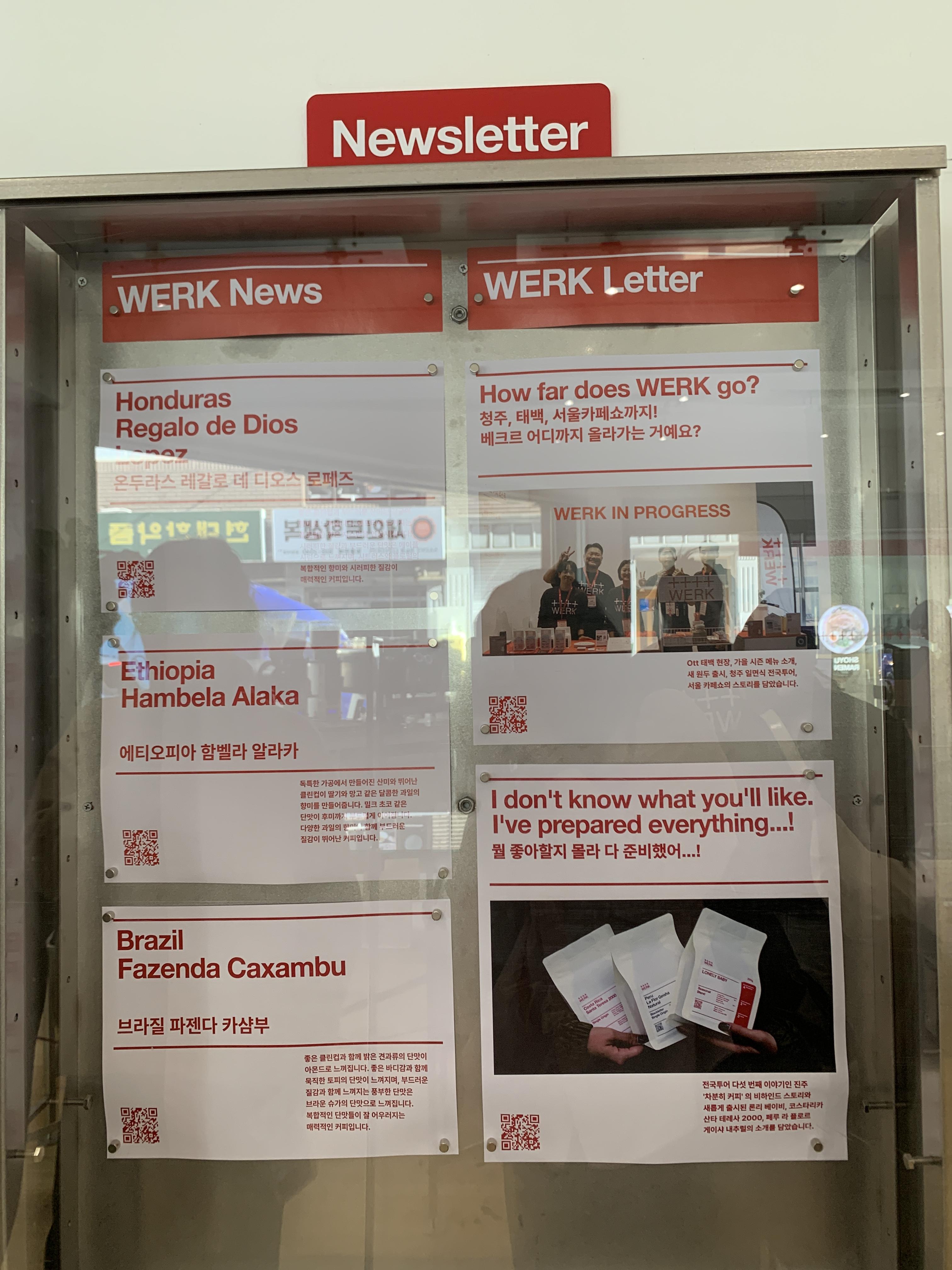 1층에서 커피를 주문하고 기다리며 이리저리 둘러봤다. 현재 베르크의 소식들이 있는 뉴스레터 게시판이 있다. 별로 의미 없어 보일 수 있지만 커피를 기다리며 이런 읽을거리를 제공해 주는 게 좋은 마케팅 방식이라고 생각했다. 사람들은 이 정보들을 보며 이 브랜드가 계속해서 발전과 업데이트가 되고 있고 브랜드 방향성에 대해서도 알게 모르게 인지할 수 있으니까. 대표적으로 스타벅스는 모든 지점에 이런 게시판들이 붙어있어 스타벅스 전체 소식이나 그 지점의 소식을 알려준다.