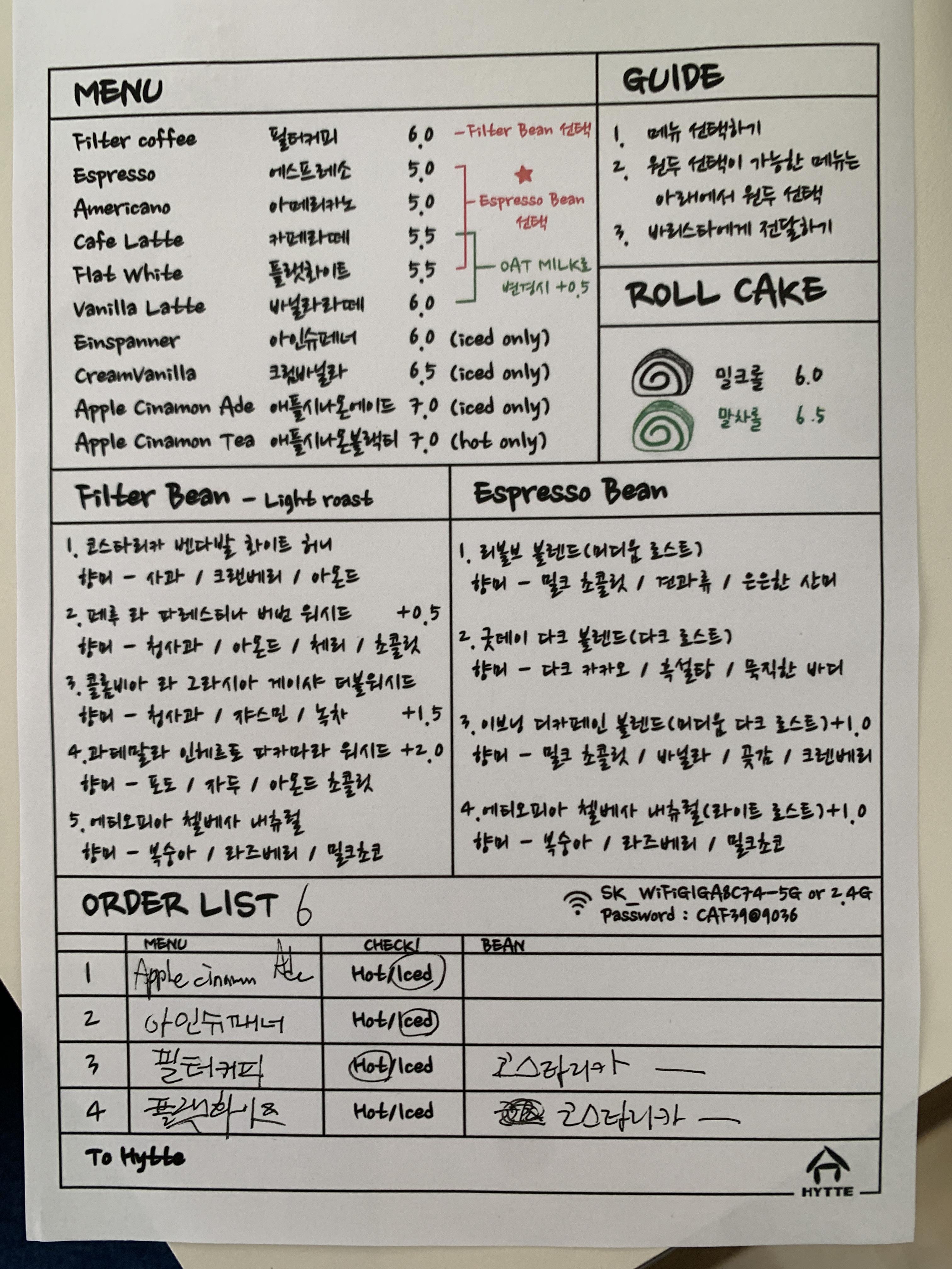 여기도 역시나 손으로 적어서 주문하는 시스템이다. 손글씨 느낌의 폰트로 둥글둥글하고 귀여운 히떼의 분위기와 잘 맞는다. 여기다가 주문할 커피를 적어서 가져다주면 된다. 선택할 수 있는 필터커피 원두와 에스프레서 원두가 각각 다르니 잘 보고 선택해서 주문해야 한다.