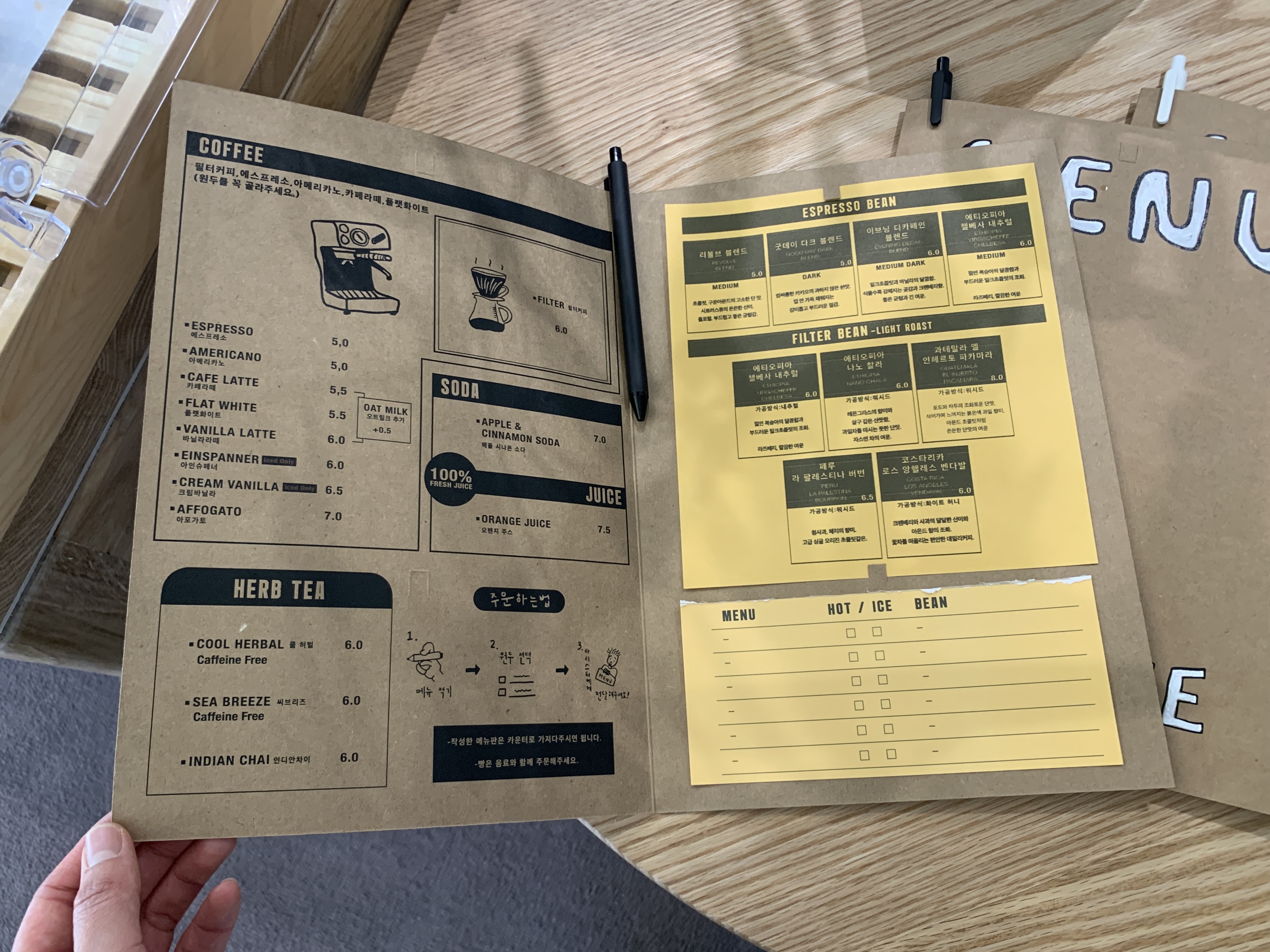 나는 혼자 가서 메뉴를 보고 바로 카운터에서 시켰는데 원래는 오른쪽 아래에 커피 체크표가 있어서 거기다가 적어서 직원에게 가져다주면 된다.