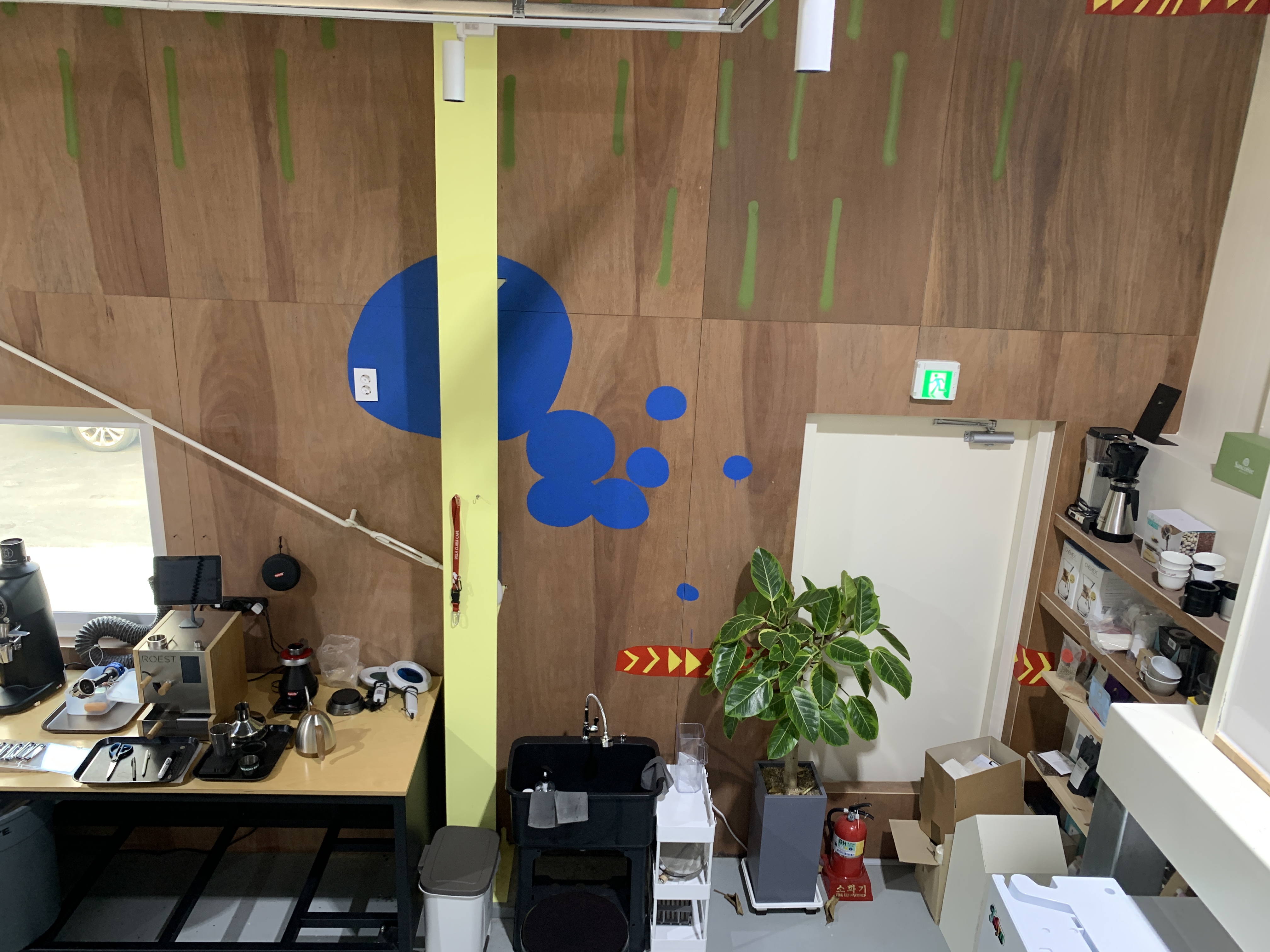 올라가면서 보이는 로스팅 실의 모습. 벽에 포인트로 그림 들어간 게 귀엽다.