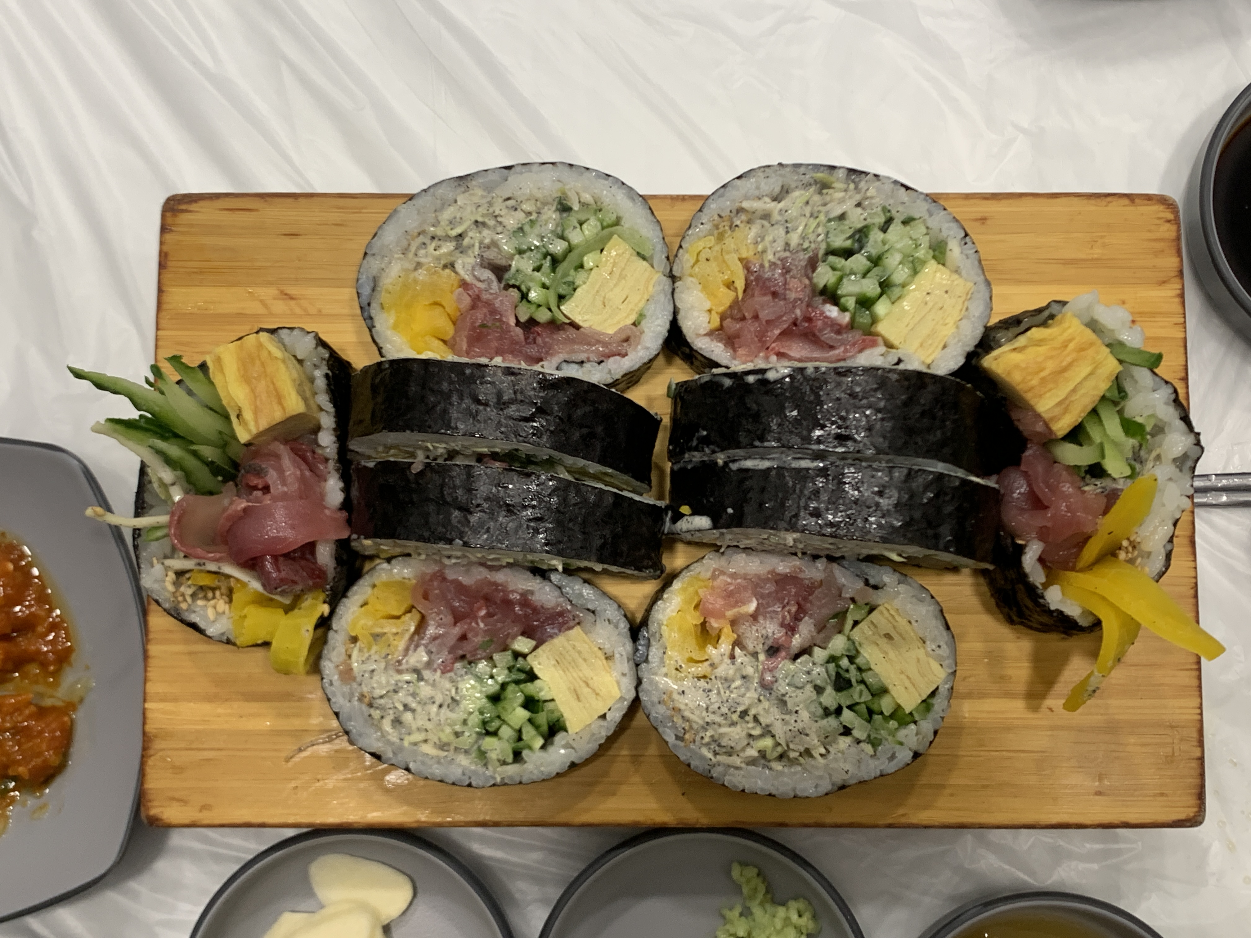 일단 방어김밥, 일명 후토마끼가 먼저 나왔다. 이게 진짜 맛있음. 그리고 저 양옆에 꽁다리가 찐이라 가위바위보해서 이긴 두 사람이 먹기 했는데 나는 져서 못 먹었다... 주르륵..
