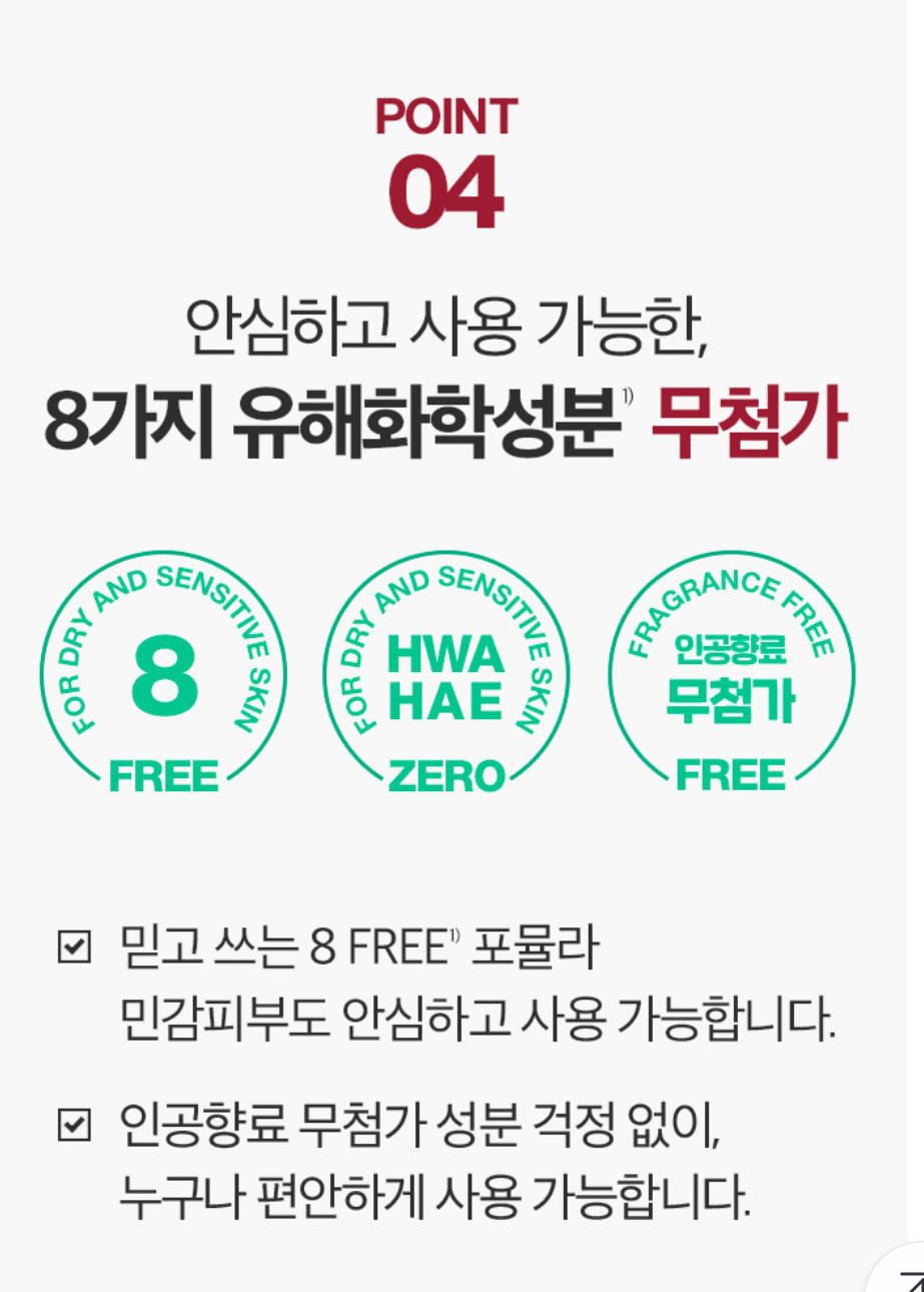 제품들 상세페이지를 보면 부풀려지고 공감 안 되는 부분이 많은데, 오랫동안 바디에멀젼을 사용해 본 결과 저 3가지는 다 맞는 것 같다. 가려움은 아빠로 증명되었고, 유해화학물질을 안 쓰는지는 몰랐지만 순해서 피부에 자극이 없었고, 발림성 역시 좋다.(이건 사용 후기 말하면서 자세히 말하도록 하겠다.)