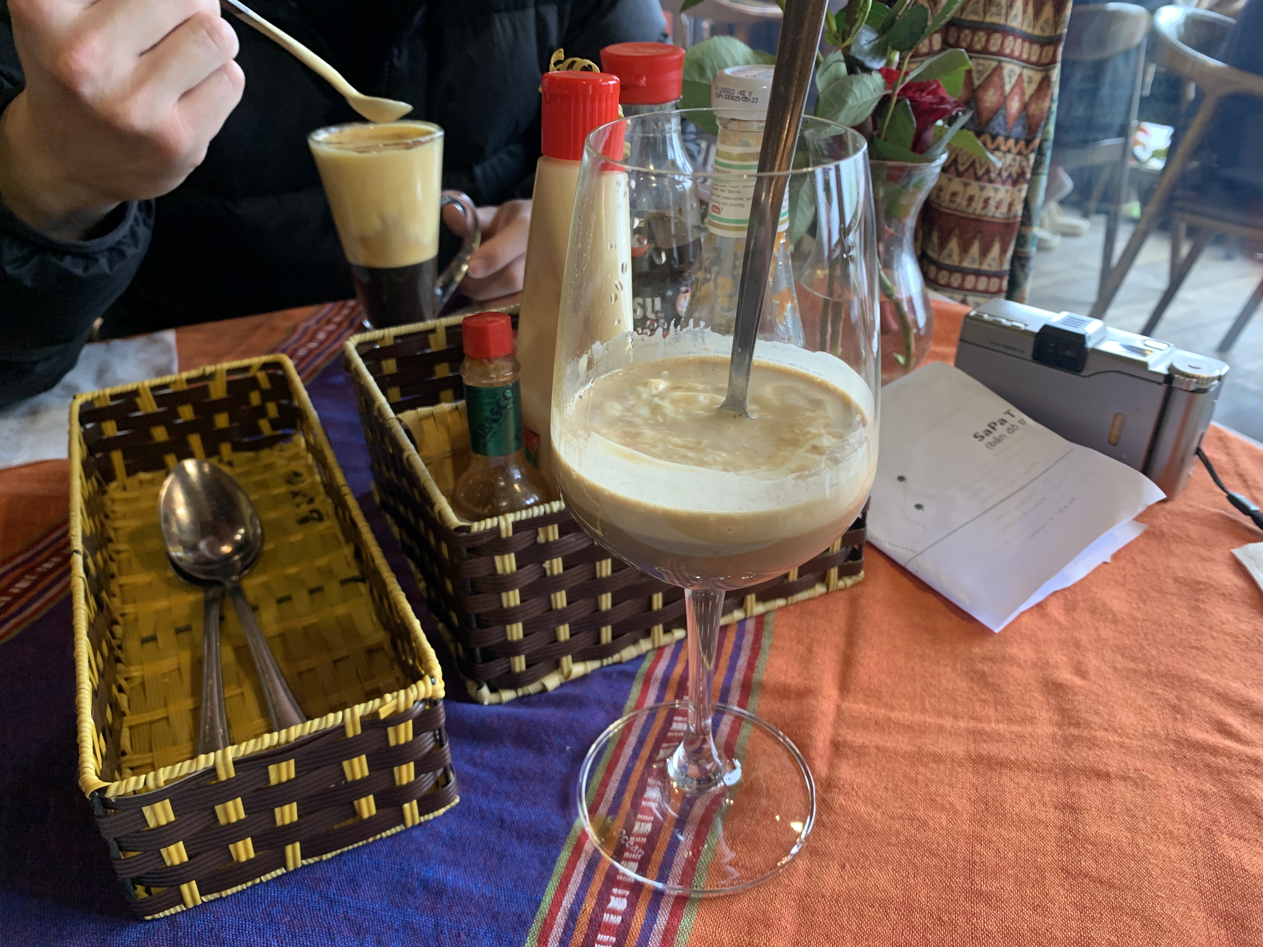 내가 시켰던 베일리스 커피. 술과 커피를 섞고 위에 크림 같은 게 올라가 있었다. 술맛이 너무 강하지도 않았고 그렇다고 너무 안나지도 않았다. 술과 커피맛의 밸런스가 좋았다. 뒤에 있는 건 에그커피! 베트남 와서 처음 먹어본 에그커피였는데, 생각했던 거랑 약간 비주얼이 달랐다. 위에 있는 달걀이 들어간 크림이 엄청 꾸덕하고 깊어서 밑에 있는 커피가 나오질 않았다. 위에 크림만 좀 파먹고 나중에는 섞어 마셨다. 그리고 조금 기다리자 감자수프가 나왔다.