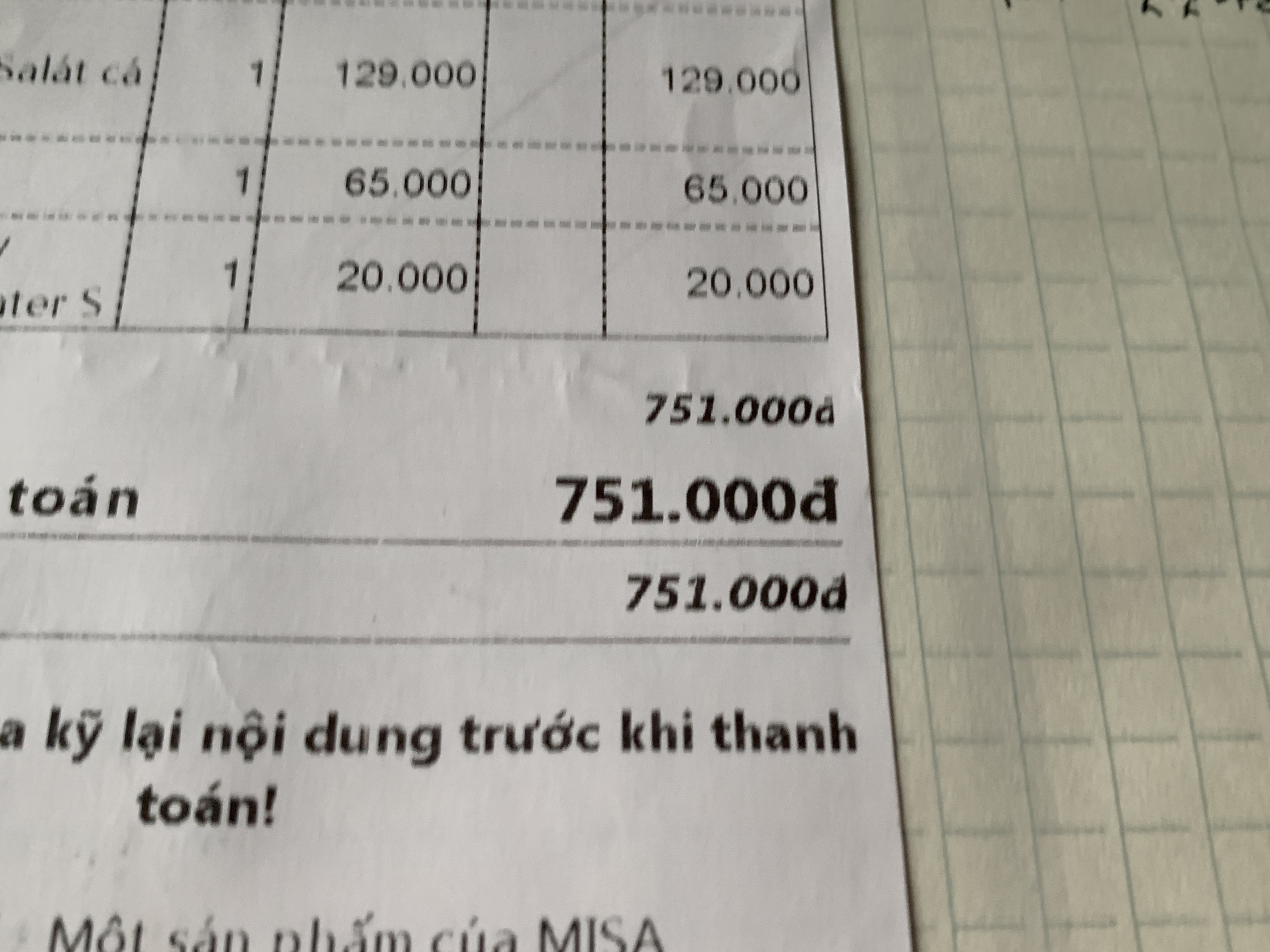 저렇게 많이 먹고도 총 751,000동(약 37,550원) 밖에 안 나왔다!