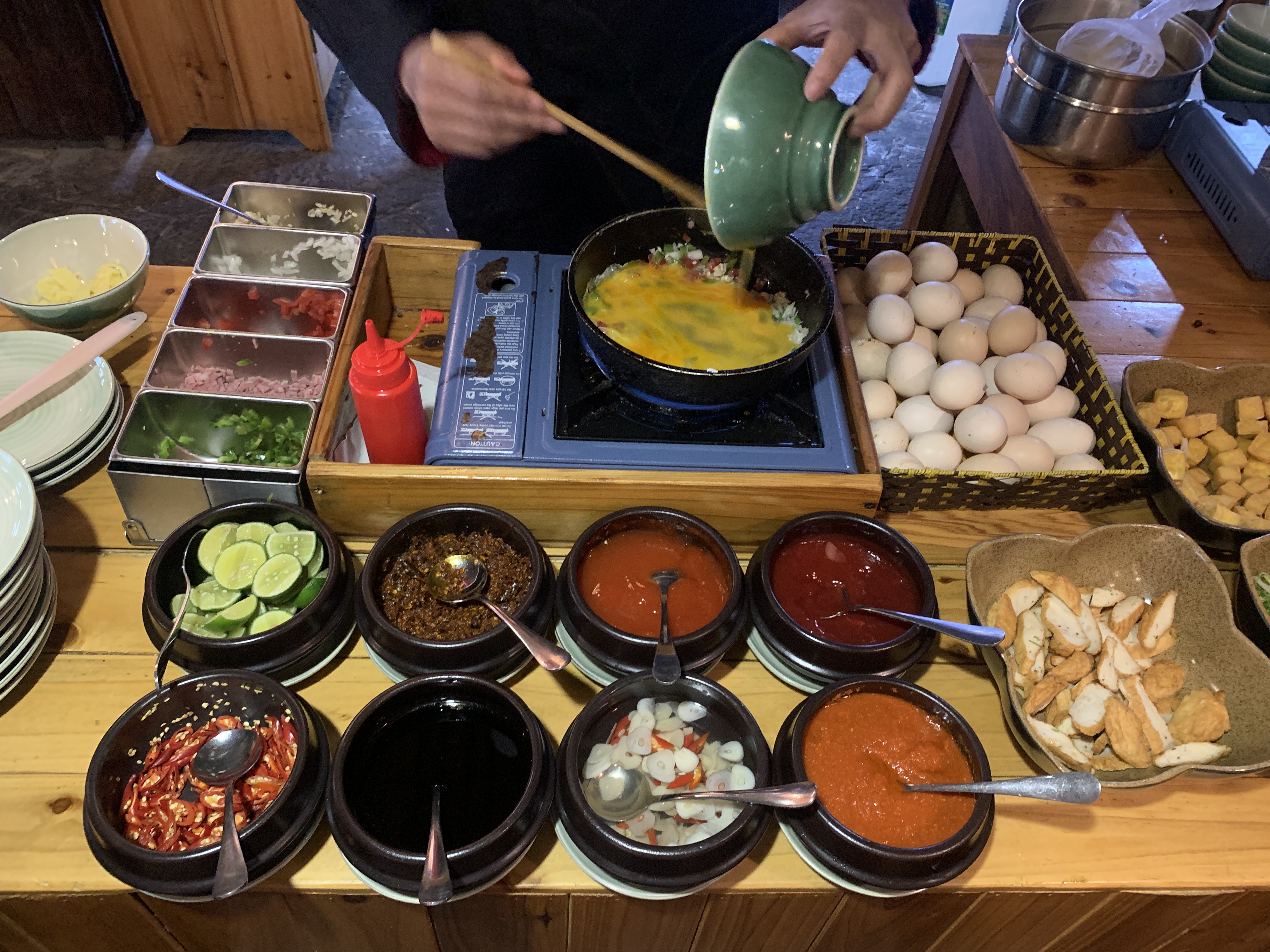 위에는 내 앞사람의 오믈렛을 만드는 모습. 앞쪽에 있는 토핑을 선택하면 넣어서 만들어준다.