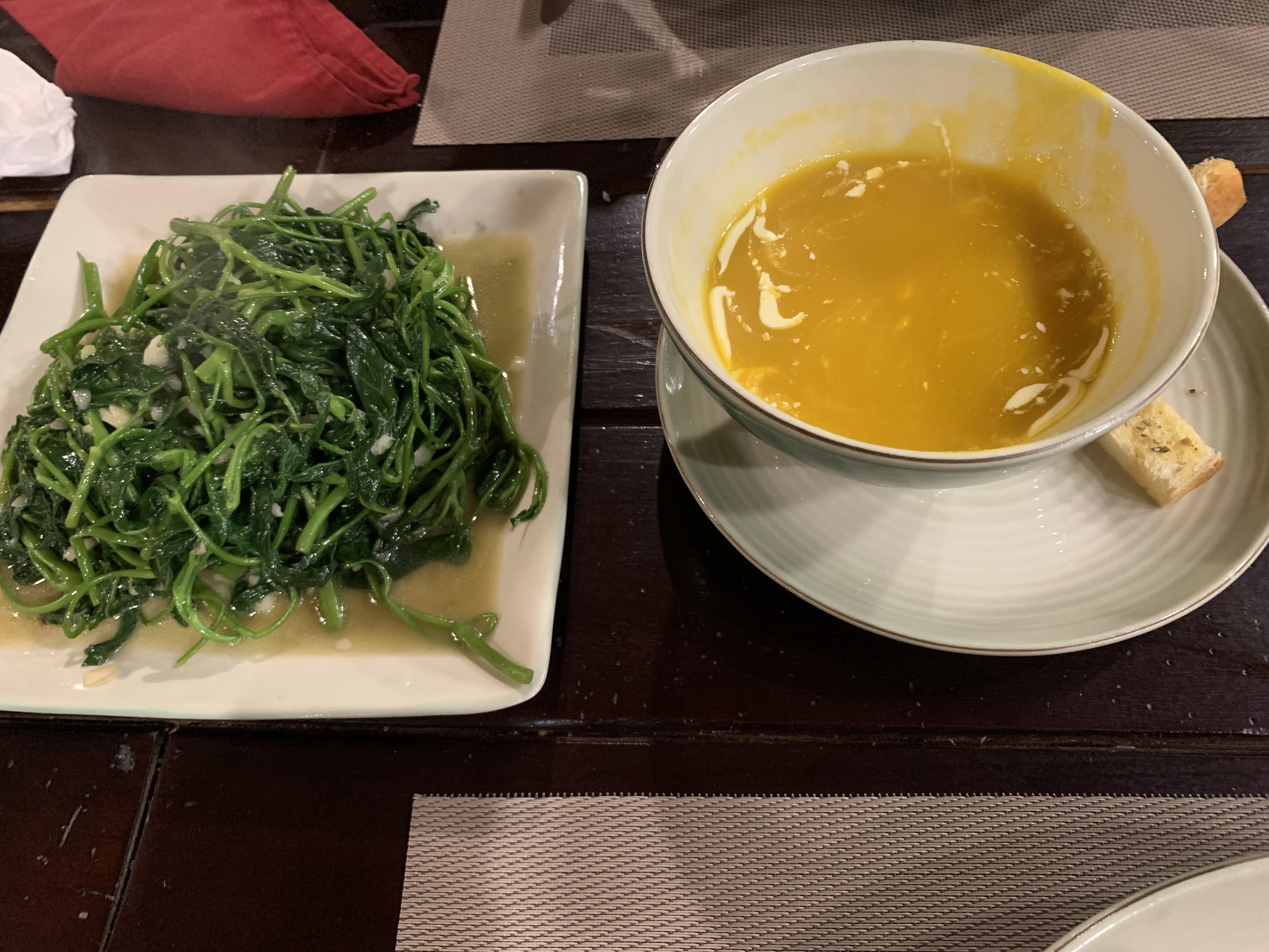 우리는 배가 불러서 많이 먹지는 않았다. 사실 우리는 공심채 볶음이 먹고 싶었는데, 메뉴판에 없길래 물어보니 원래는 메뉴에 없지만 만들어 주겠다고 하셨다. 그래서 호박죽과 공심채를 시켜서 먹었다. 공심채는 진짜 맛있었지만 개인적으로 호박죽은 좀 싱거워서 아쉬웠다. 핫팟도 있고 쌀국수도 있으니 저녁을 이곳에 들어와서 먹어도 좋았을 것 같다.