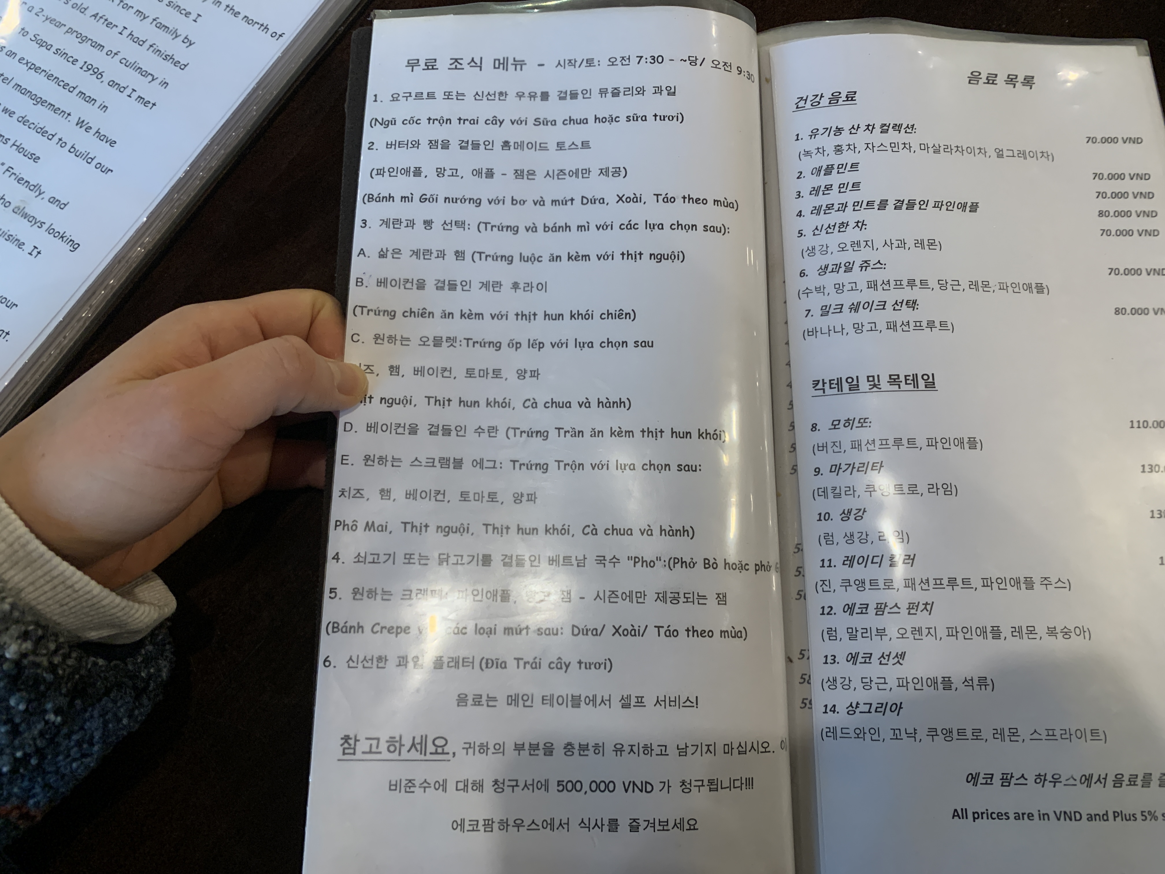 한국인들이 많아와서 그런지 한국어로 된 메뉴판도 있고, 한국어를 할 수 있는 직원분도 한분 계신다. 에코팜 하우스가 뷔페식이 아니라 주문하면 나오는 시스템으로 운영되는 이유는, 아마도 버려지는 음식물 때문인 것 같았다. 물론 에코팜 하우스도 자유롭게 메뉴를 시켜서 먹을 수도 있지만 음식물을 남기면 500,000동(한국돈 25,000원)을 내야 하니 시킬 만큼만 주문하자.