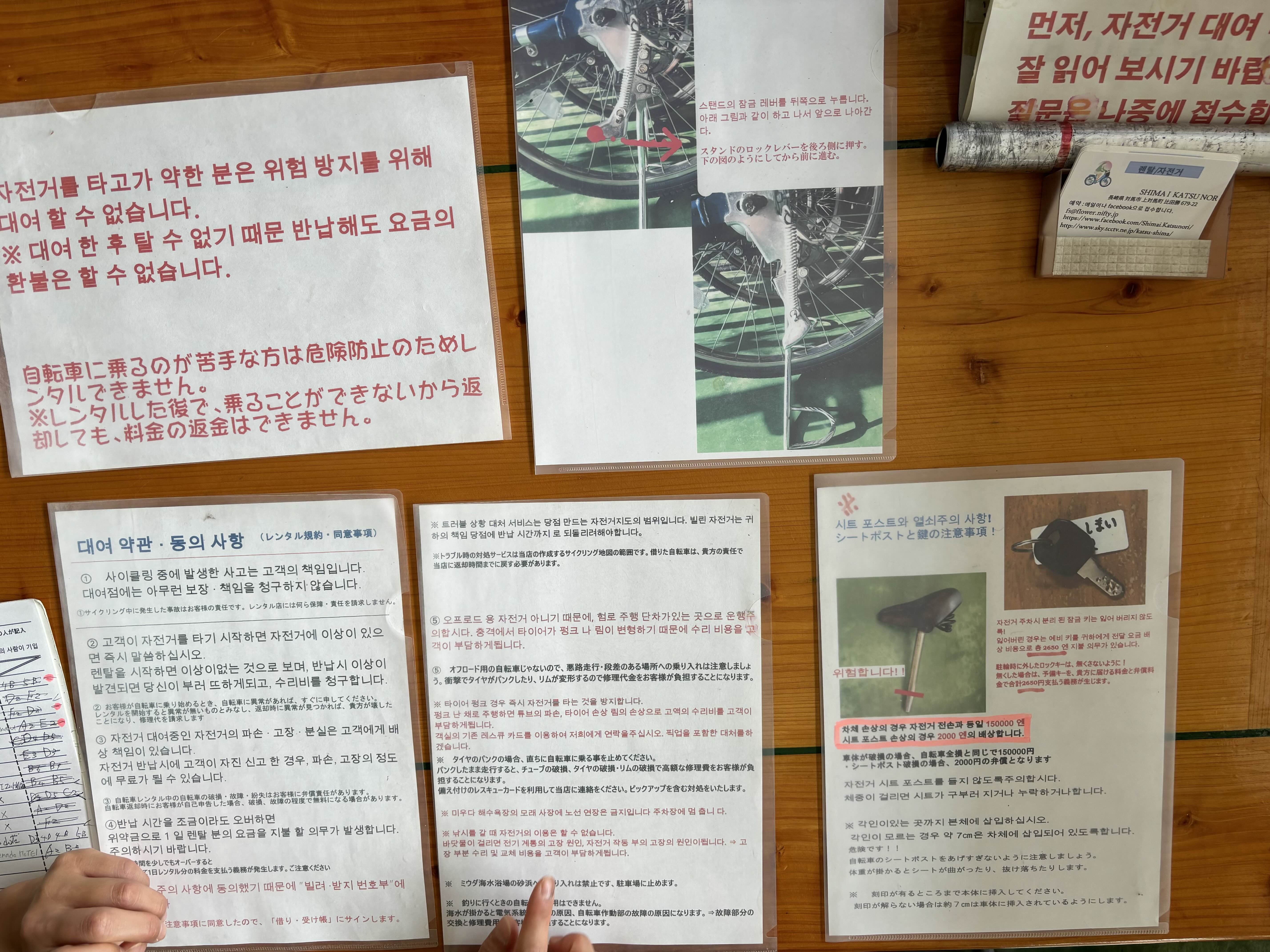 | 1:예약한 사람의 이름과 성별: 2: 자전거를 타는 사람의 남성 수와 여성 수 :남자( ) 여자( ) 3:주소: 4:전화번호: 5:도착선박명: 6 : 내점 일시 : (월 · 일 · 시) 가게에 오는 시간입니다. 7:빌리는 일수: 8:자전거의 대수: 9:렌탈 당일 귀국할지, 숙박할지: 10:숙박의 경우, 숙박처의 이름: |