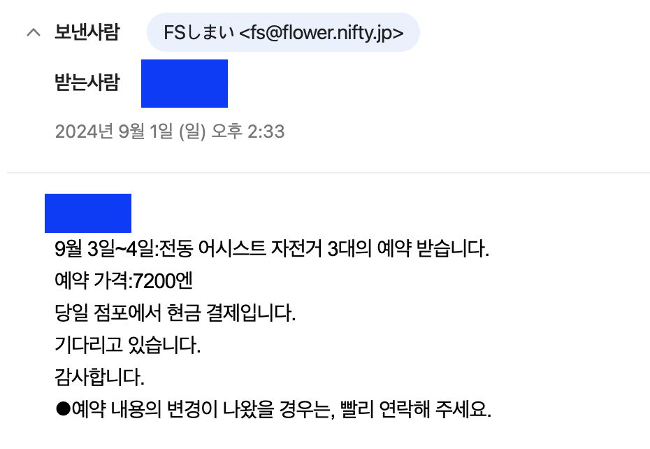 대마도에서 자전거를 빌릴 수 있는곳은 몇 군데 있는 것 같았는데 우리는 <시마이 플라워 샵>이라는 곳에서 자전거를 빌리기로 했다. 왜냐면 가서 현장에서 빌리면 하루에 1500엔인데 메일로 미리 예약을 하고 가면 1200엔으로 인당 300엔 즉 3000원을 할인 받을 수 있기 때문이다. 우리는 3명이었고, 총 2일을 빌리니 18,000원 정도를 저렴하게 빌릴 수 있었다.