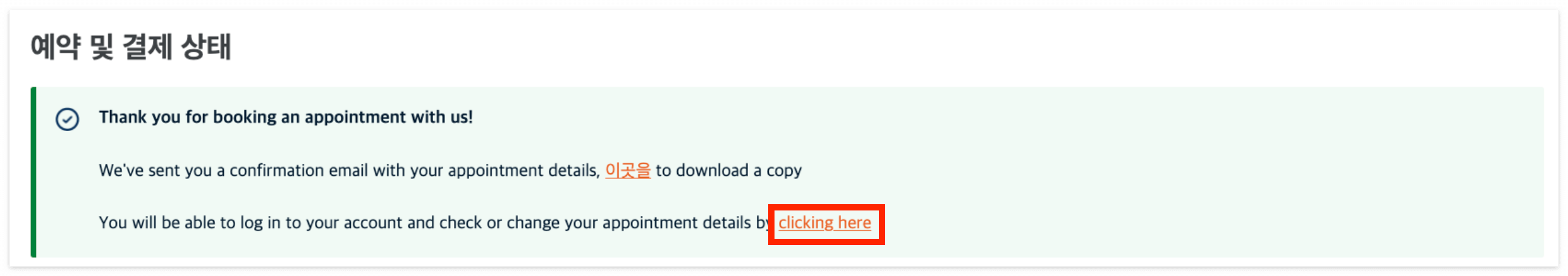 아래 화면을 보면 2가지 링크가 있는데, '이곳'을 이라고 된 곳을 누르면 예약확인증이 다운로드되는데, 이 예약확인증은 메일로도 오기 때문에 굳이 안 눌러도 된다. 주황색으로 'clicking here'이라고 체크된 곳으로 들어가면 내 계정에 들어가서 스케쥴을 바꾸거나 서류를 업로드할 수 있다.