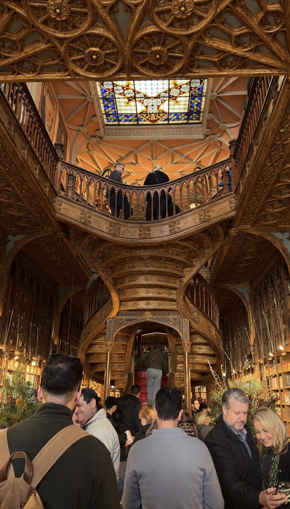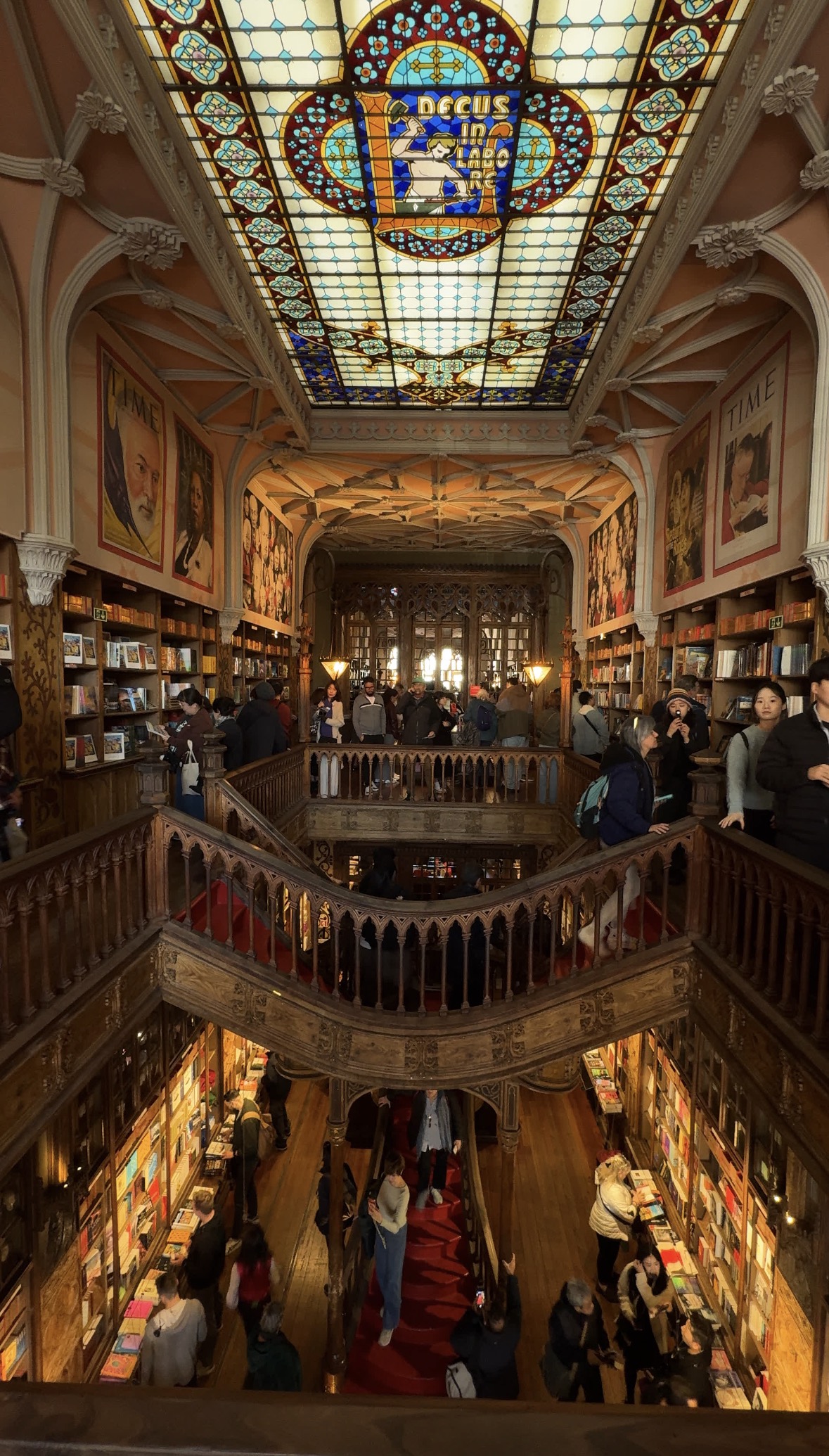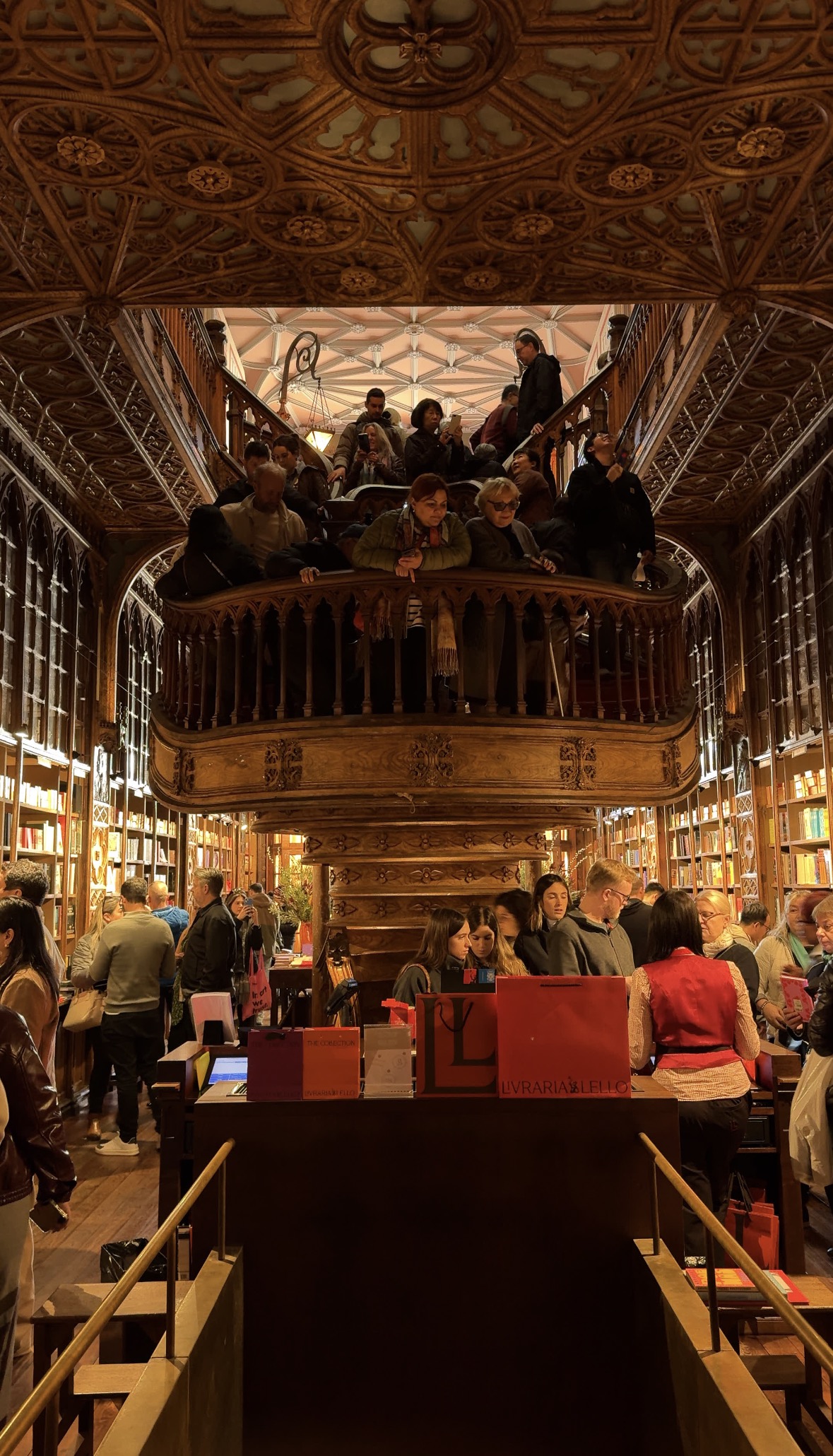 포르투갈에 오기 전 사진과 영상으로 많이 보았던 렐루 서점이었기에 처음엔 화면 속 풍경과 크게 다르지 않다고 느꼈다. 입구에 들어서면 가장 먼저 시선을 끄는 것은 중앙의 붉은 계단. 특이하게도 아래쪽이 막혀 있어 1층 공간은 생각보다 더 좁게 느껴졌다. 하지만 계단을 오르면 1층에서 보던 것과 또 다른 장면이 펼쳐진다. 1층에서는 구조상 2층이 잘 보이지 않아 약간은 답답한데, 계단을 지나 2층에 올라서면 갑자기 1층 전체가 훤히 내려다보이며 탁 트인 느낌을 준다. 이런 시점에 따른 공간의 변화가 렐루 서점을 더 풍성하게 만들어 준다.