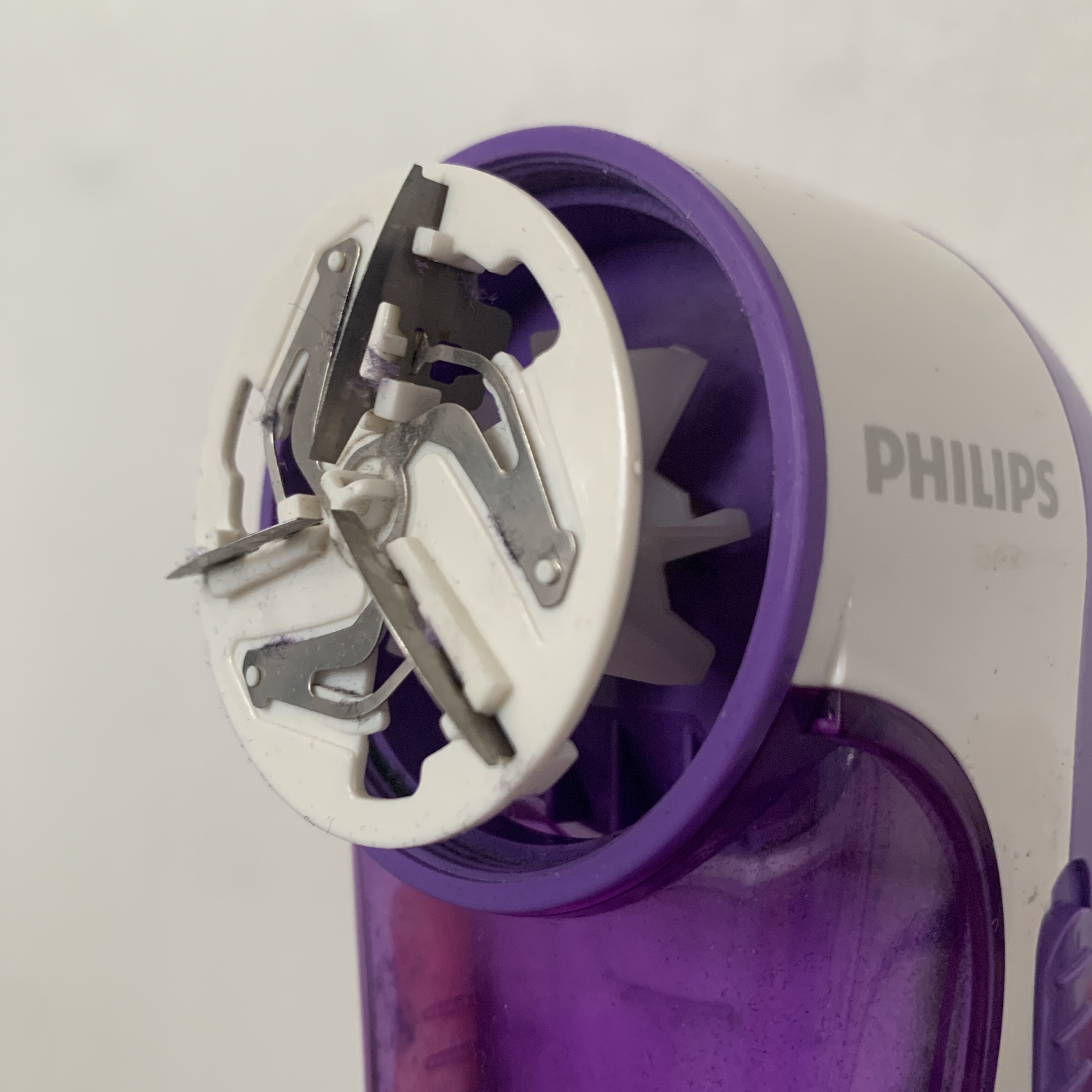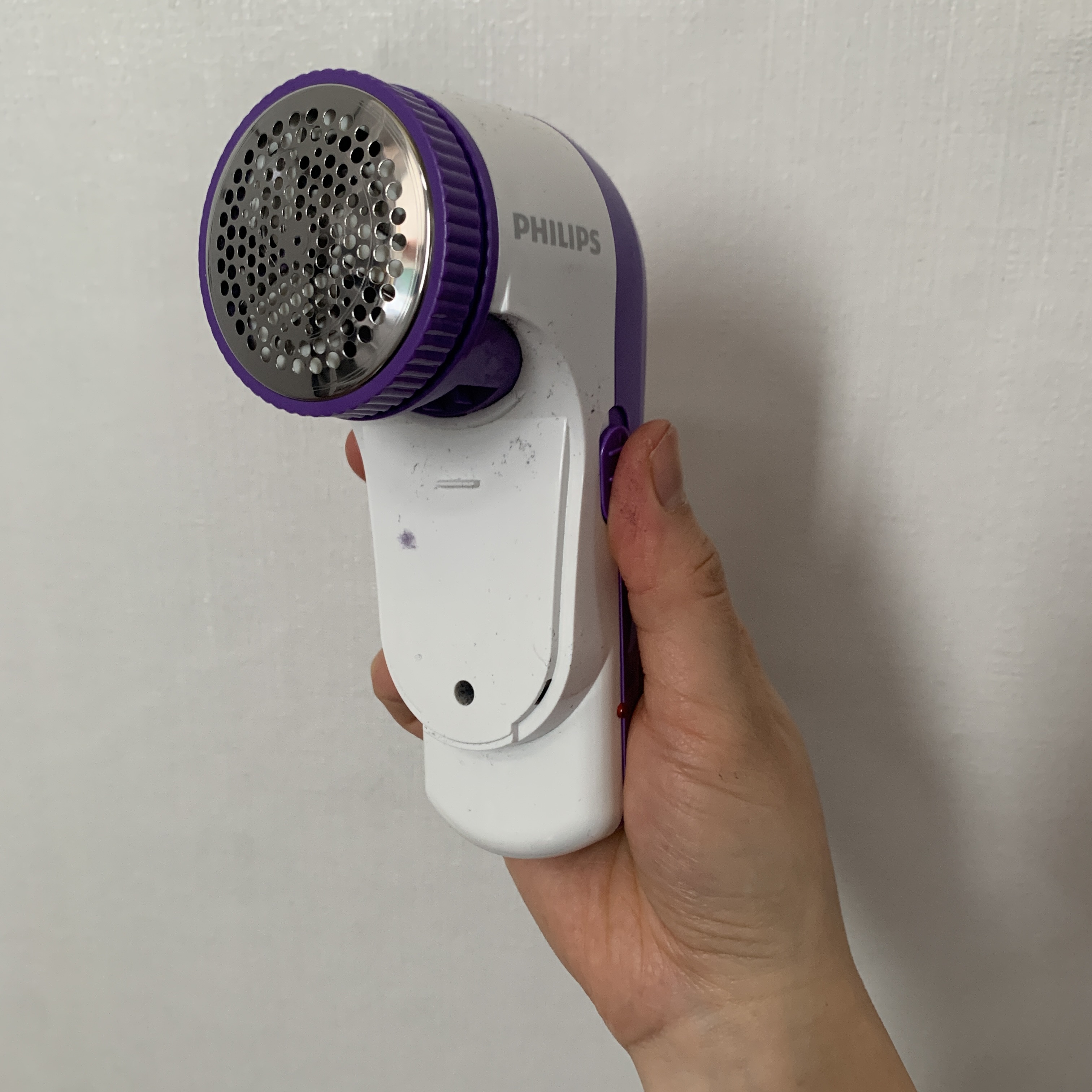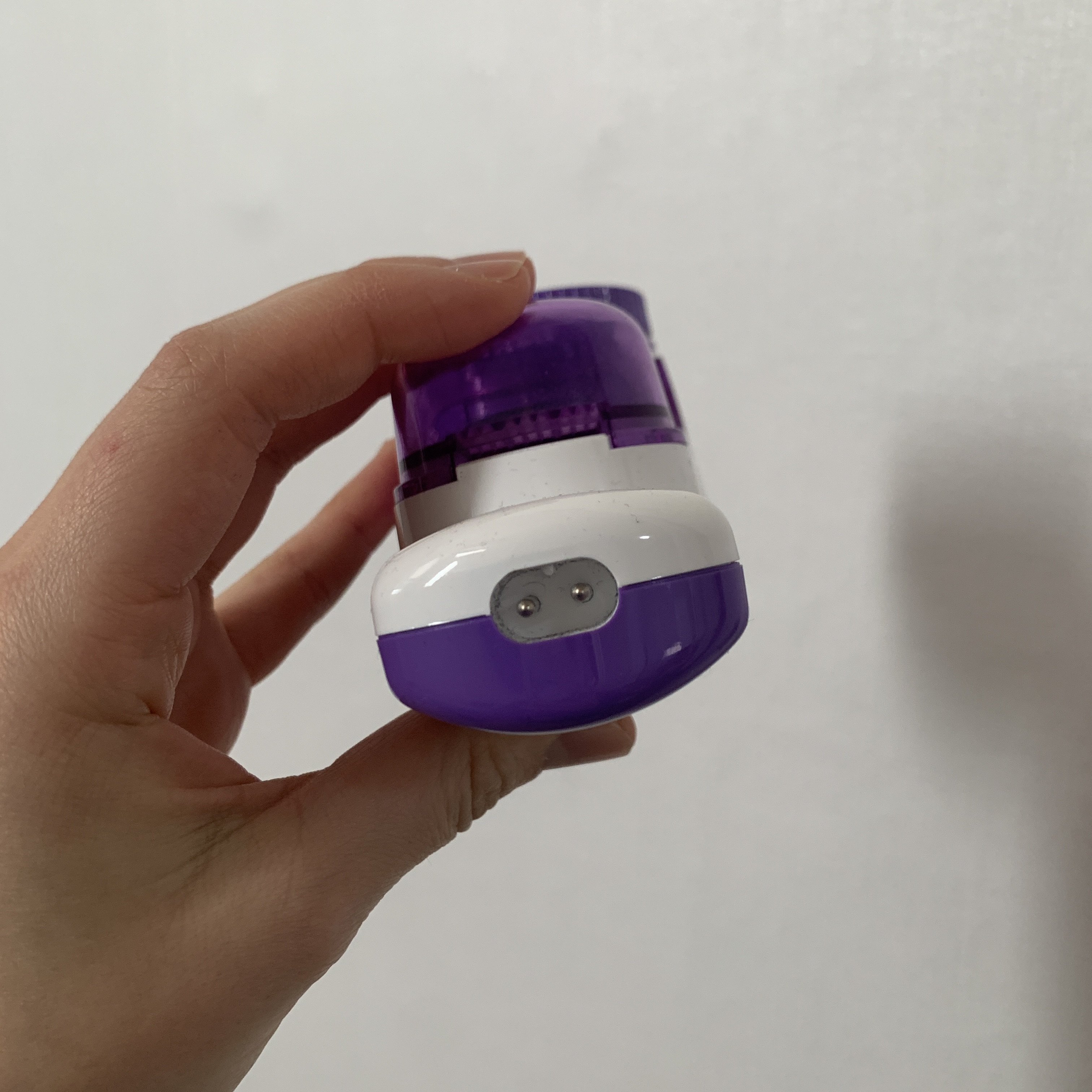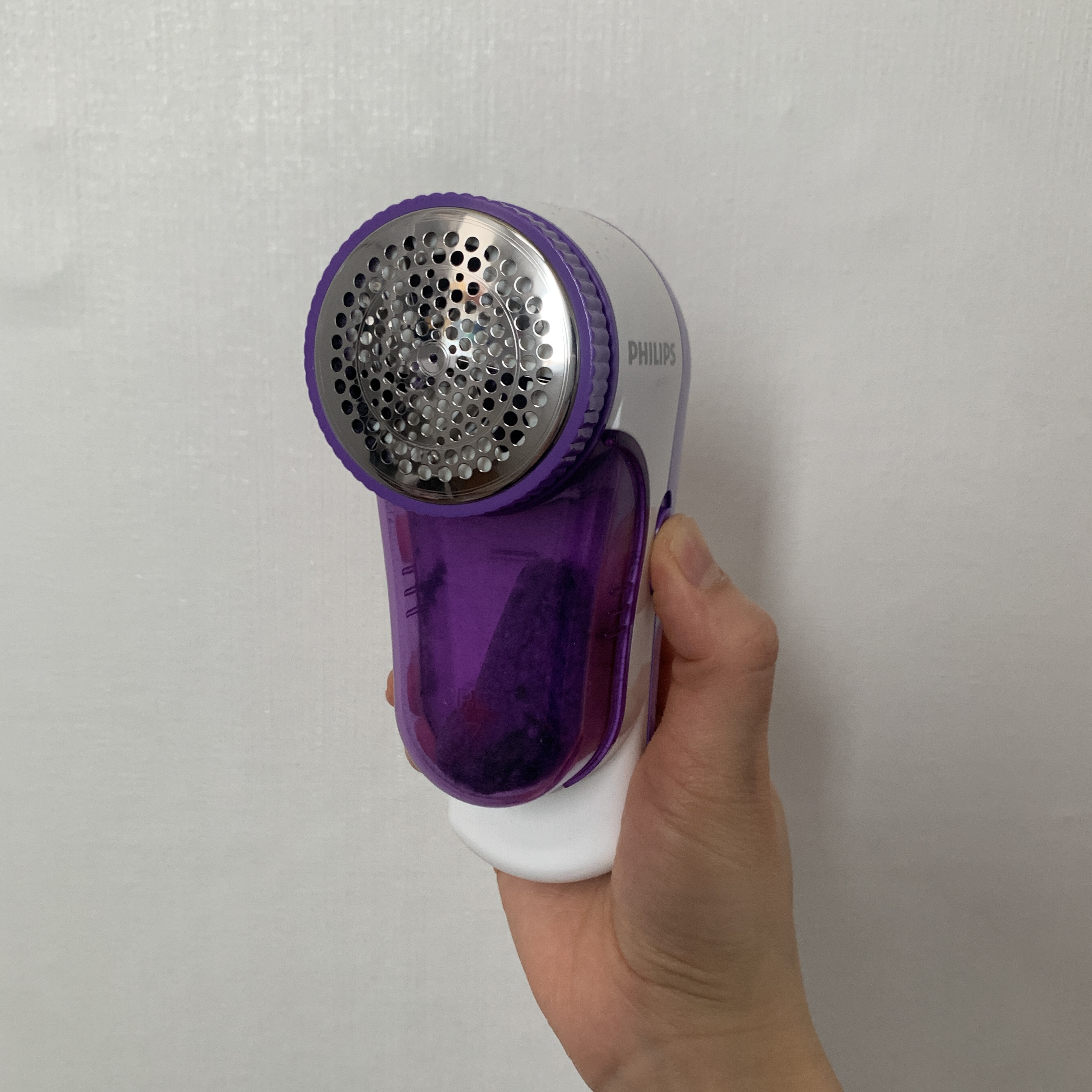 그냥 생김새만 보면 뭐 하는 제품인가 싶다. 나도 맨 처음 이 기계만 봤을 때는 전혀 어디에 쓰는 물건인지 몰랐다. 저 은색 머리 부분이 보풀을 제거해 주는 역할을 하는 곳이고(저기 구멍 안에 3개의 칼날이 있는데 빠르게 돌아가면서 저기 구멍으로 들어간 보풀들을 잘라내 주는 원리다.) 밑에 보라색 플라스틱은 제거된 보풀들이 모이는 곳이다.