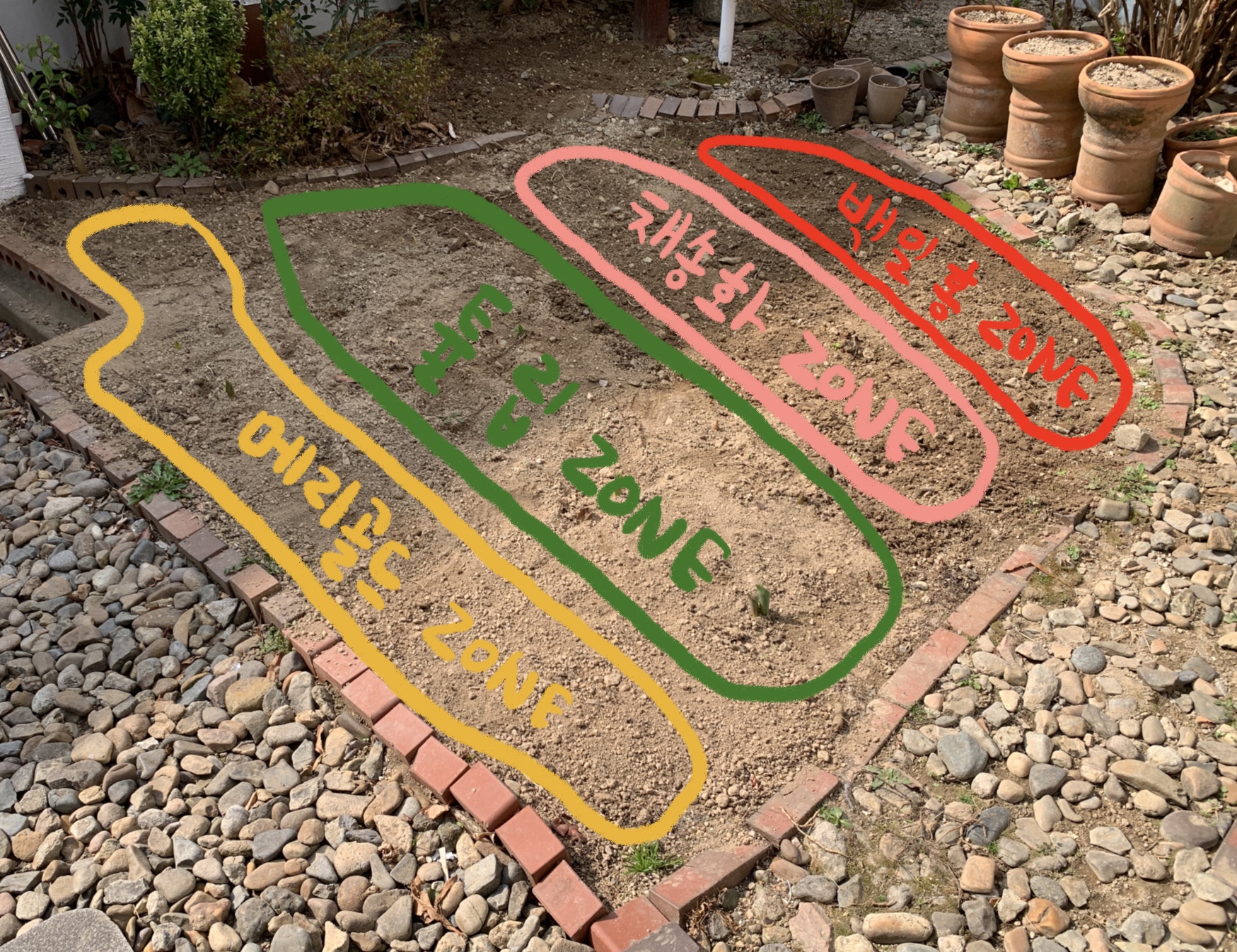 위의 사진은 미니미니한 우리 집 화단이다. 나름대로 꽃의 Zone들을 선택해 봤는데 맨 앞이 낮은 메리골, 두 번째가 튤립, 세 번째가 채송화, 네 번째가 키가 큰 백일홍으로 배치해 점점 높아서 꽃들이 다 잘 보일 수 있도록 하려고 했으나 알고 보니 채송화의 키가 생각보다 작아서 메리골드와 튤립이 피면 가릴 것 같아 걱정된다. 하지만 위에서 말한 것처럼 채송화는 500립이나 심어서 키보다는 양으로 승부하면 잘 보일 것 같기도 하다.