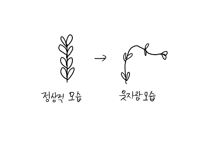 식물이 적당하게 균등한 속도로 자라지 못하고 키만 크고 잎과 잎사이의 간격이 넓게 자라는 경우 ‘웃자란다’라고 표현한다.