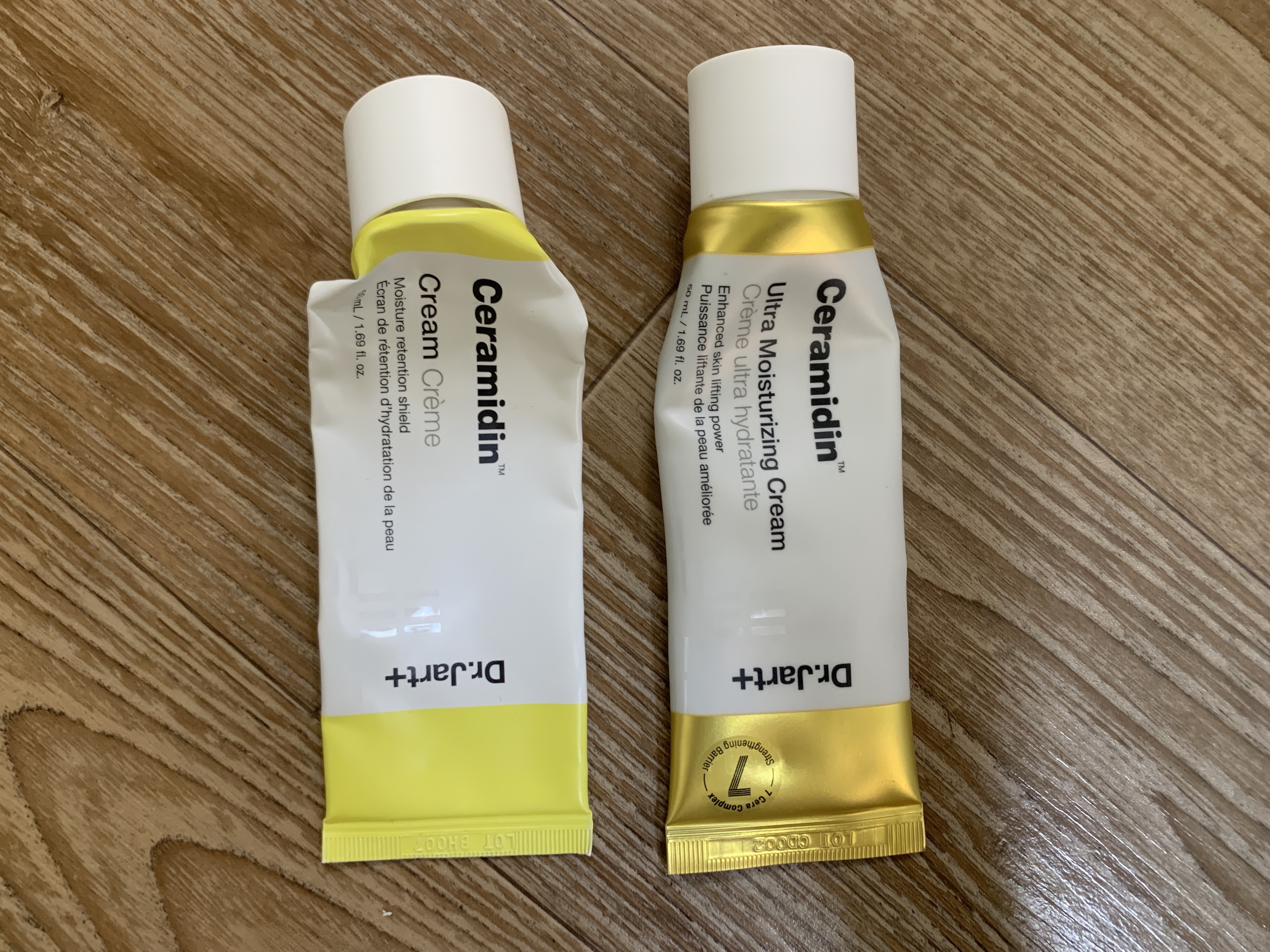 왼쪽에 매트한 패키지가 기존의 세라마이딘 크림, 오른쪽의 반짝거리는 금색의 패키지가 울트라 모이스처라이징 크림이다. 이름에서 볼 수 있듯이 새로 나온 라인이 좀 더 촉촉한 라인이라고 보면 된다.