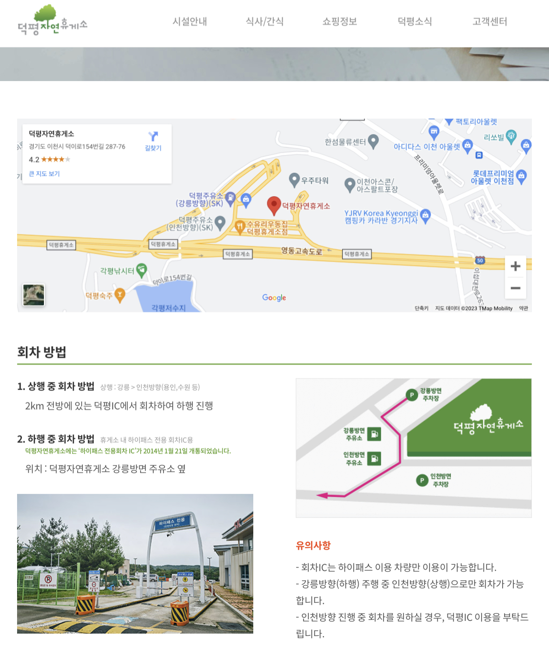 덕평자연휴게소는 회차가 가능한데, 인천방향으로 가던 차가 회차를 원할 경우는 덕평 ic로 회차하여야 하고, 강릉방향으로 가던 차가 회차를 원할 경우에는 휴게소 안에 강릉 방면 주유소 옆에 있는 하이패스 전용 회차로를 이용하면 된다. *하이패스 차량만 이용가능