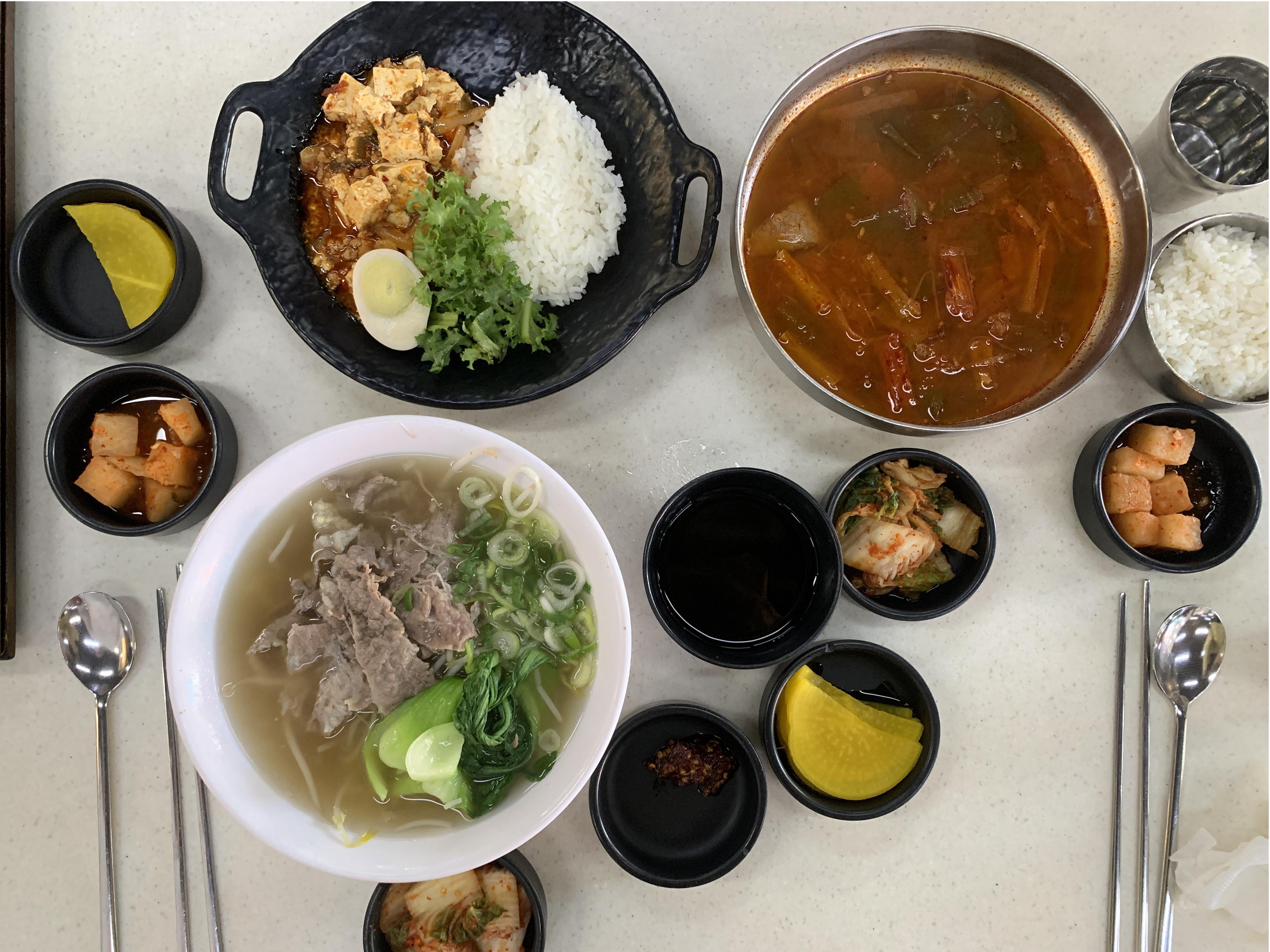 왼쪽 위부터 시계방향으로 마파두부밥, 파 육개장, 차돌양지쌀국수.