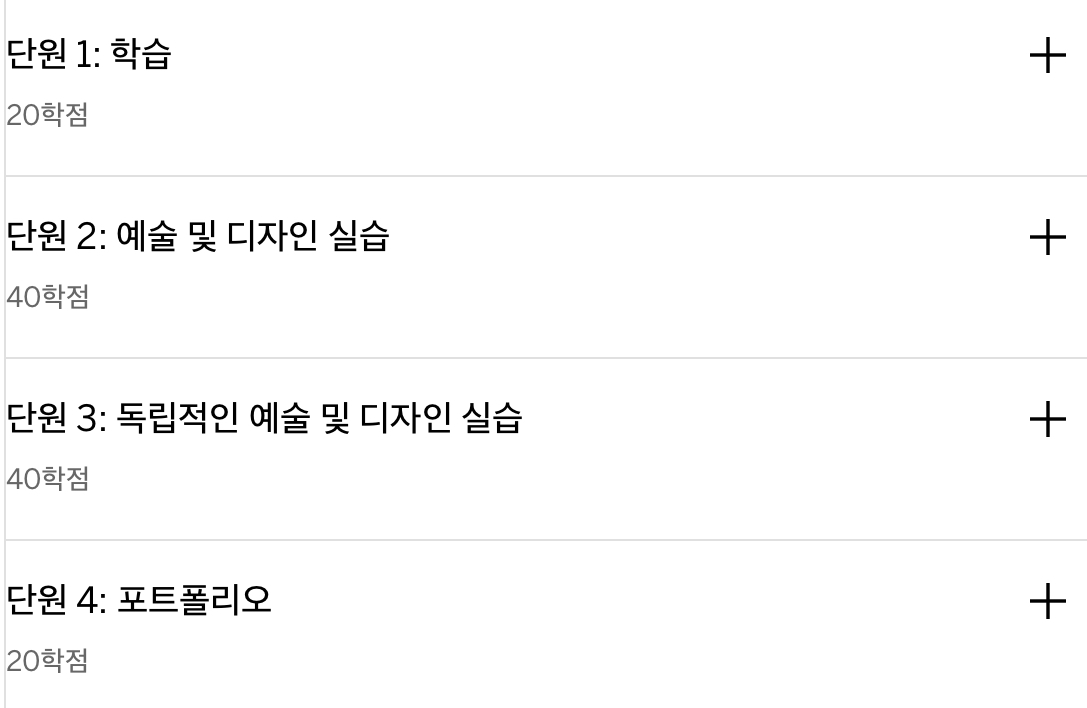 *1단계(15주)에서는 예술 및 디자인분야에서 석사 수준의 전문연구에 대한 소개를 배울 수 있고 2단계(15주)에서는 좀 더 심층적인 연수, 실습, 포트폴리오 개발을 할 수 있다.