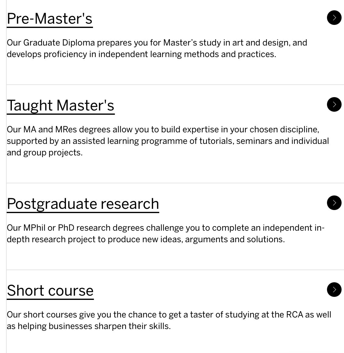 영국왕립예술학교는 학부과정이 없고 바로 석사와 박사과정만을 제공하는 디자인 전문학교이다. 영국왕립예술학교는 Graduate Diploma, MA, MArch, MEd, MFA, MDes, MRes, MPhil and PhD의 학위를 제공한다. 우리나라 학위는 주로 학사, 석사, 박사로 나누어져 있지만 외국에서는 조금 더 세분화해서 표현하기도 한다. (이건 미국, 호주, 영국 모두 다른 경우도 있다)