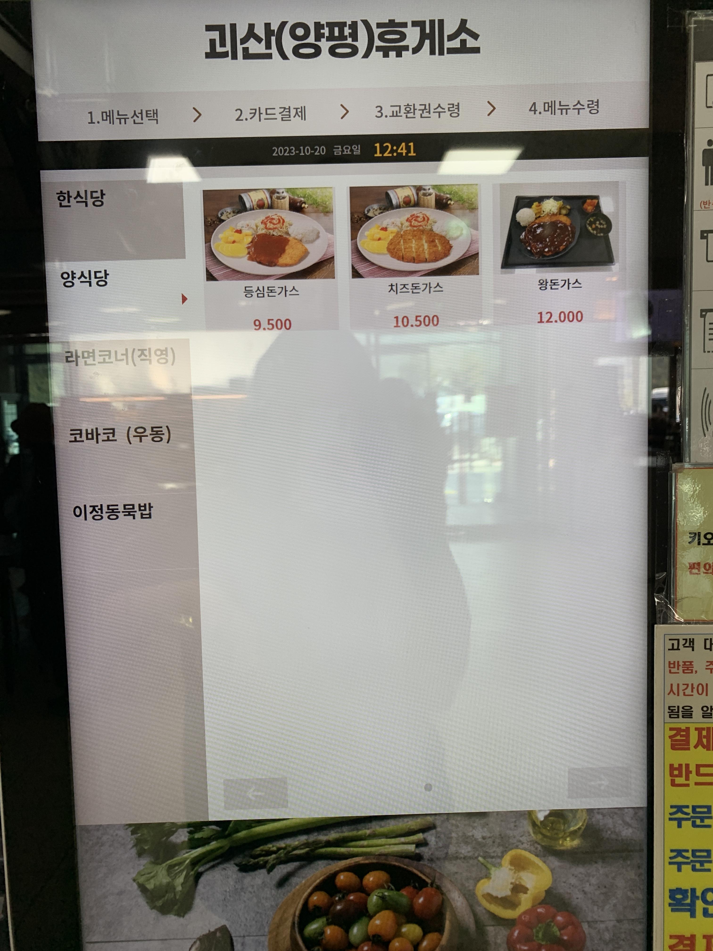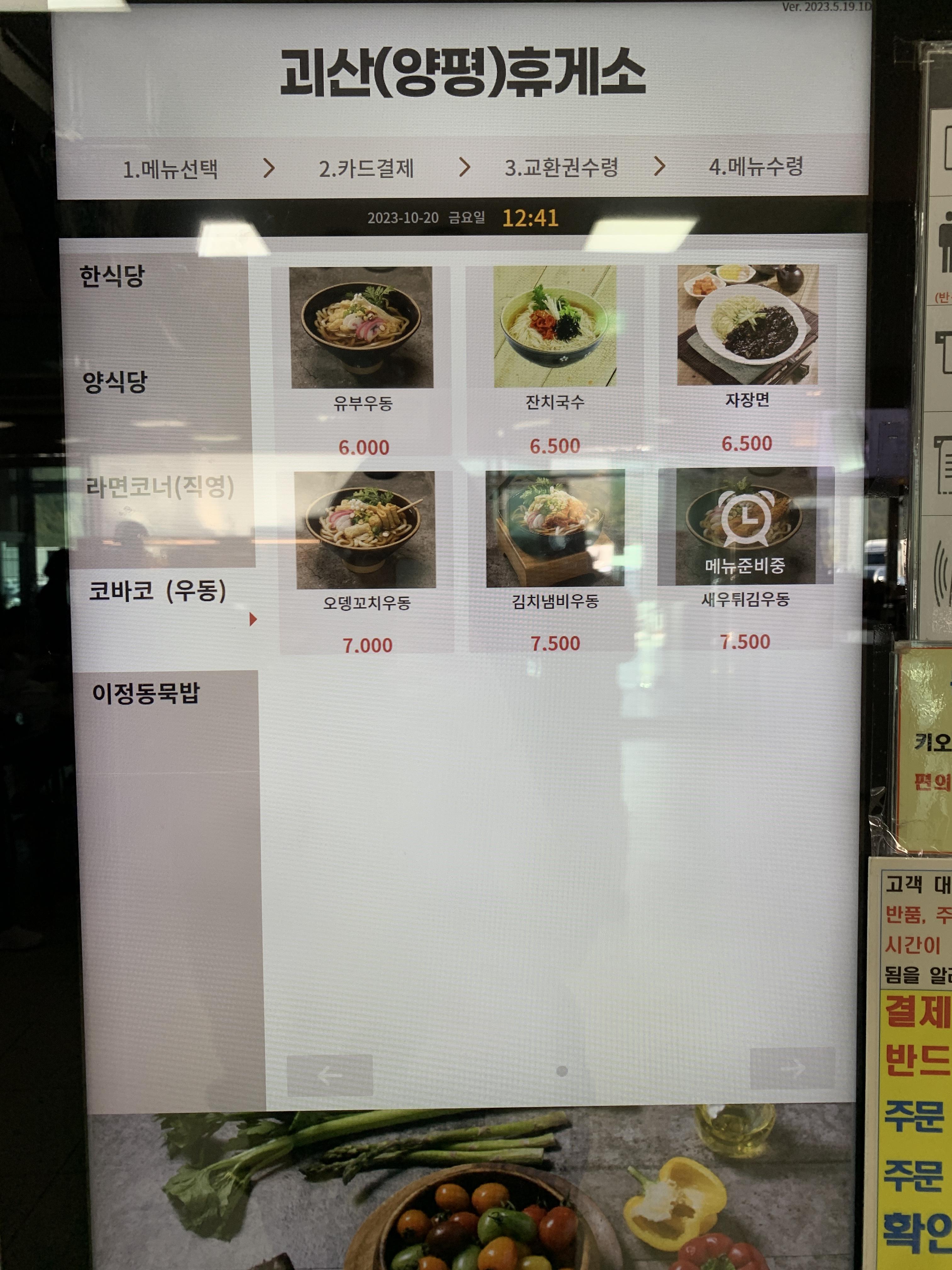 괴산(양평) 휴게소의 음식 분야는 5개로 나누어져 있다. 한식당, 양식당, 라면코너(직영), 코바코(우동), 이정도 묵밥. 코바코랑 이정동묵밥은 휴게소 자체 음식이 아니라 브랜드에서 들어와서 하는 음식인 것 같았다. 음식은 들어와서 키오스크에서 주문하면 된다.