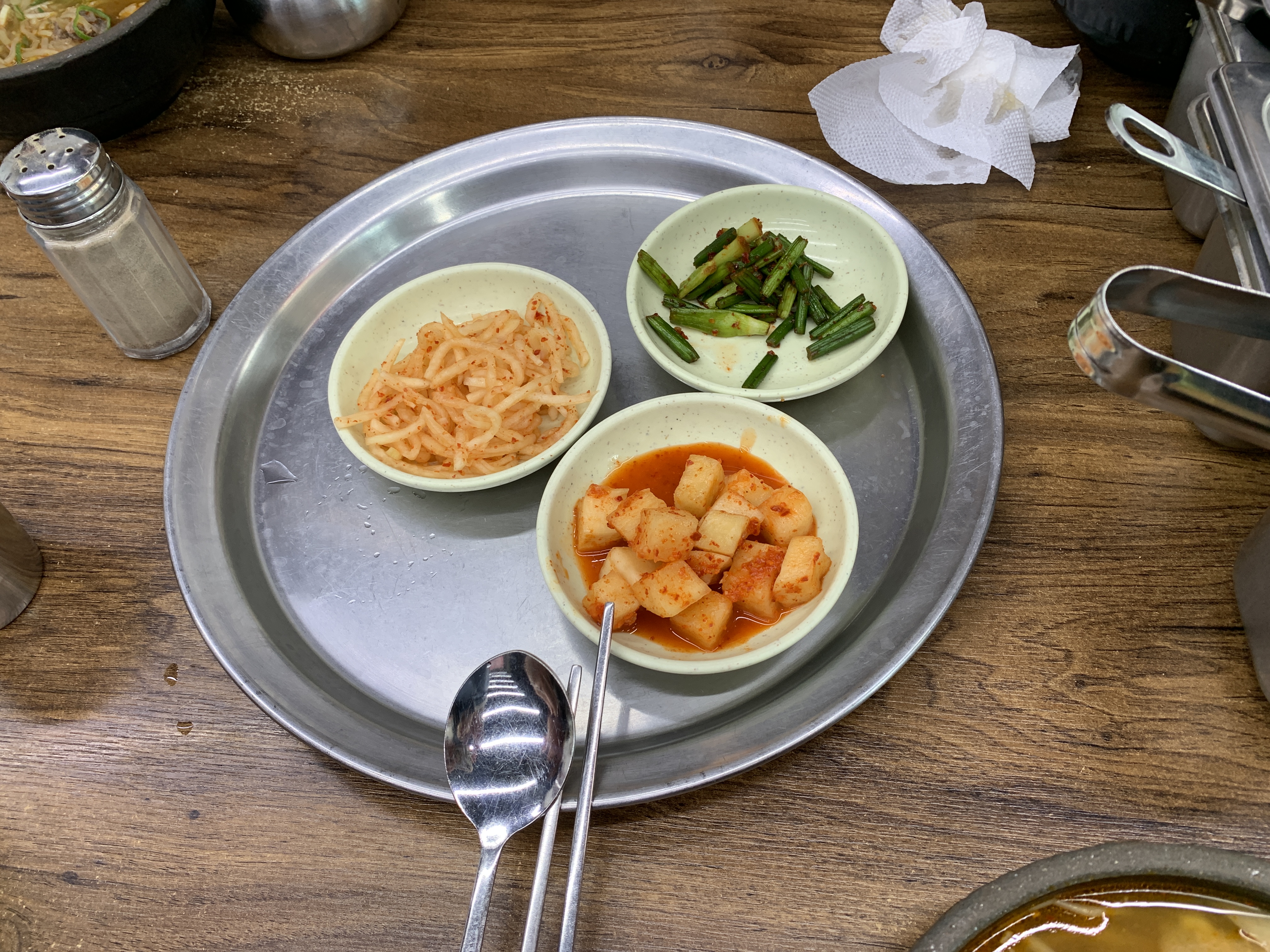제공되는 반찬들. 각자 테이블에 반찬통이 있어서 원하는 만큼 덜어먹을 수 있다.