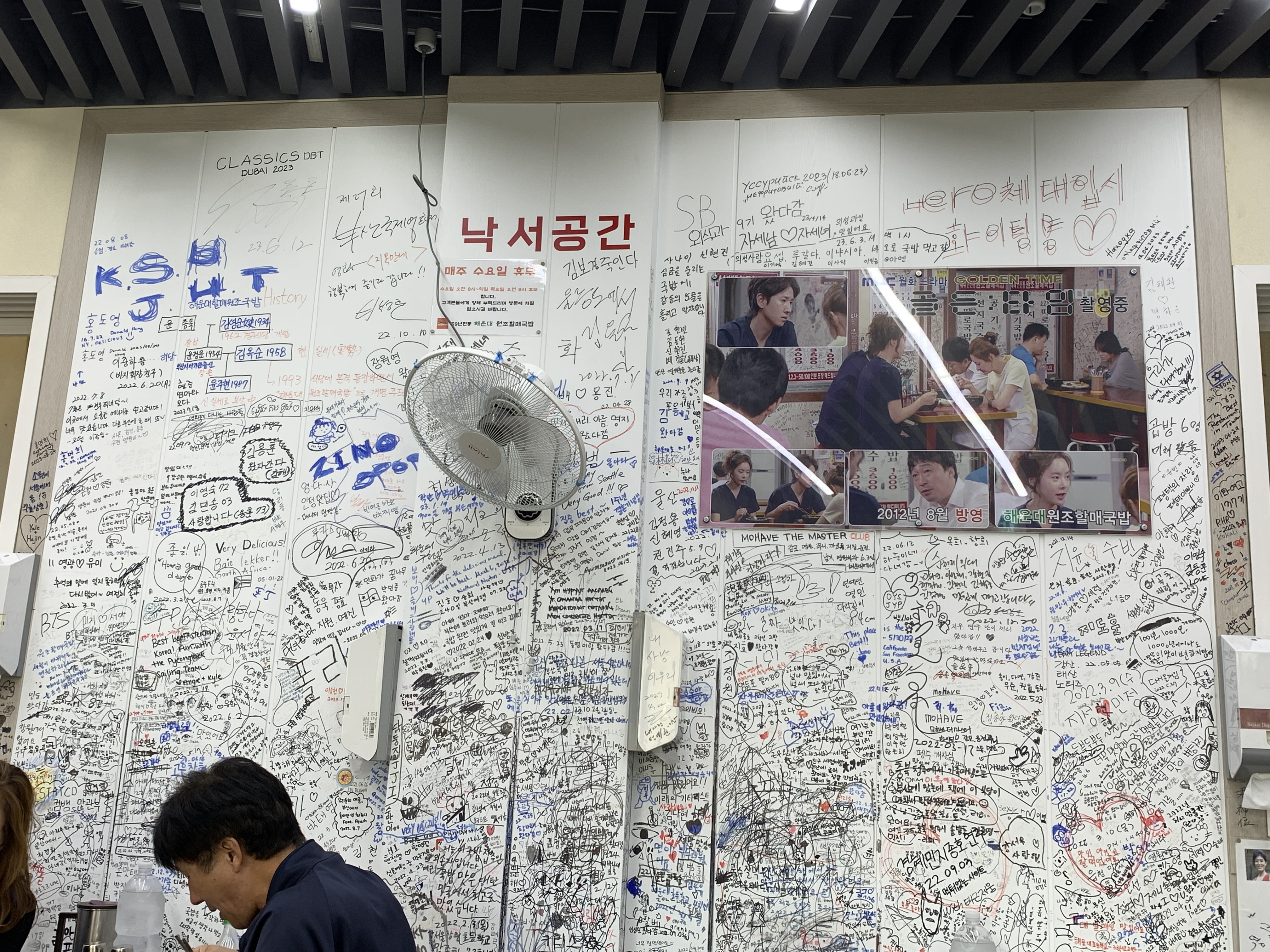 들어가니 벽에 낙서들과 각종 방송에서 나온 모습들이 부착되어 있었다.