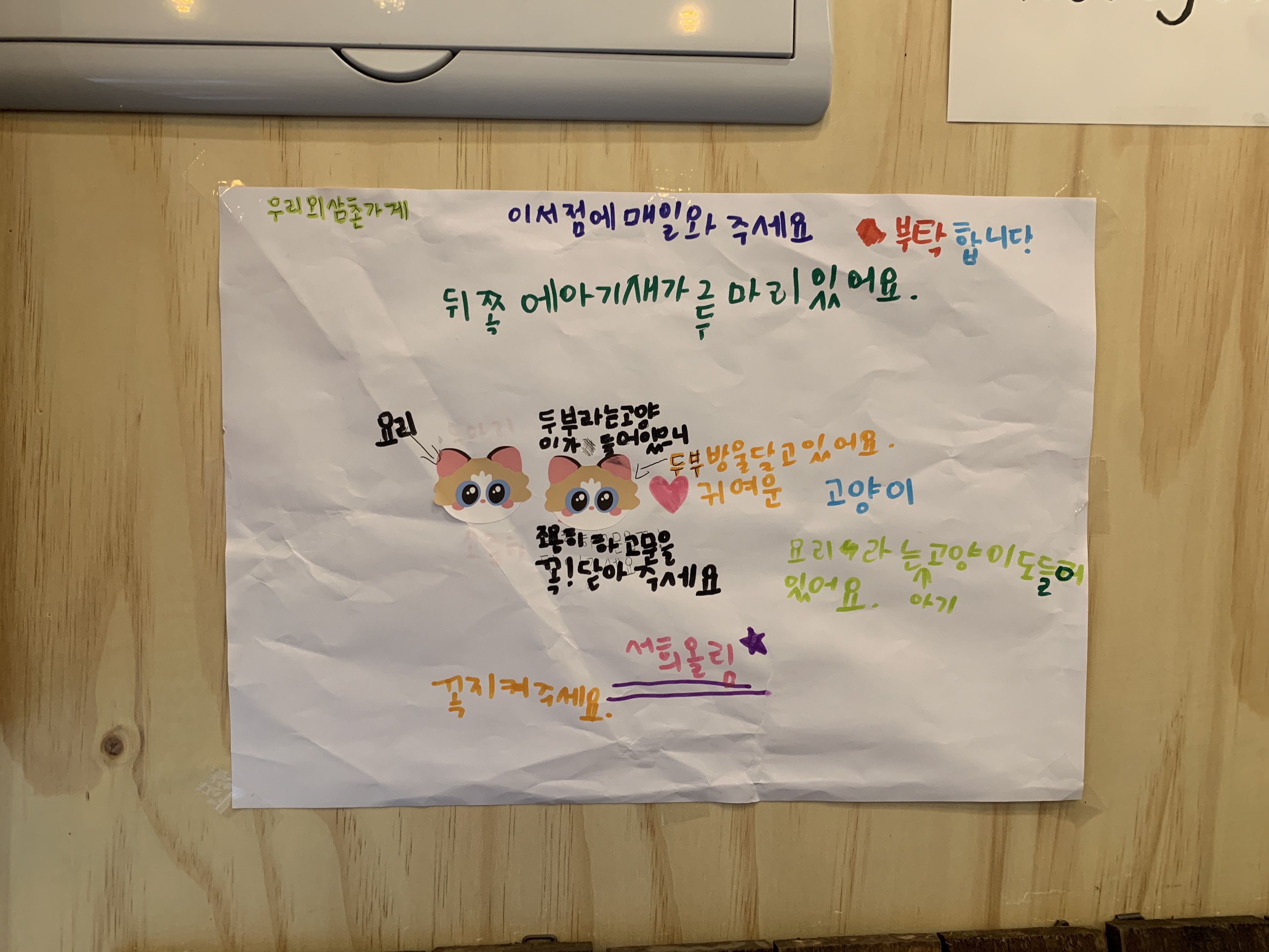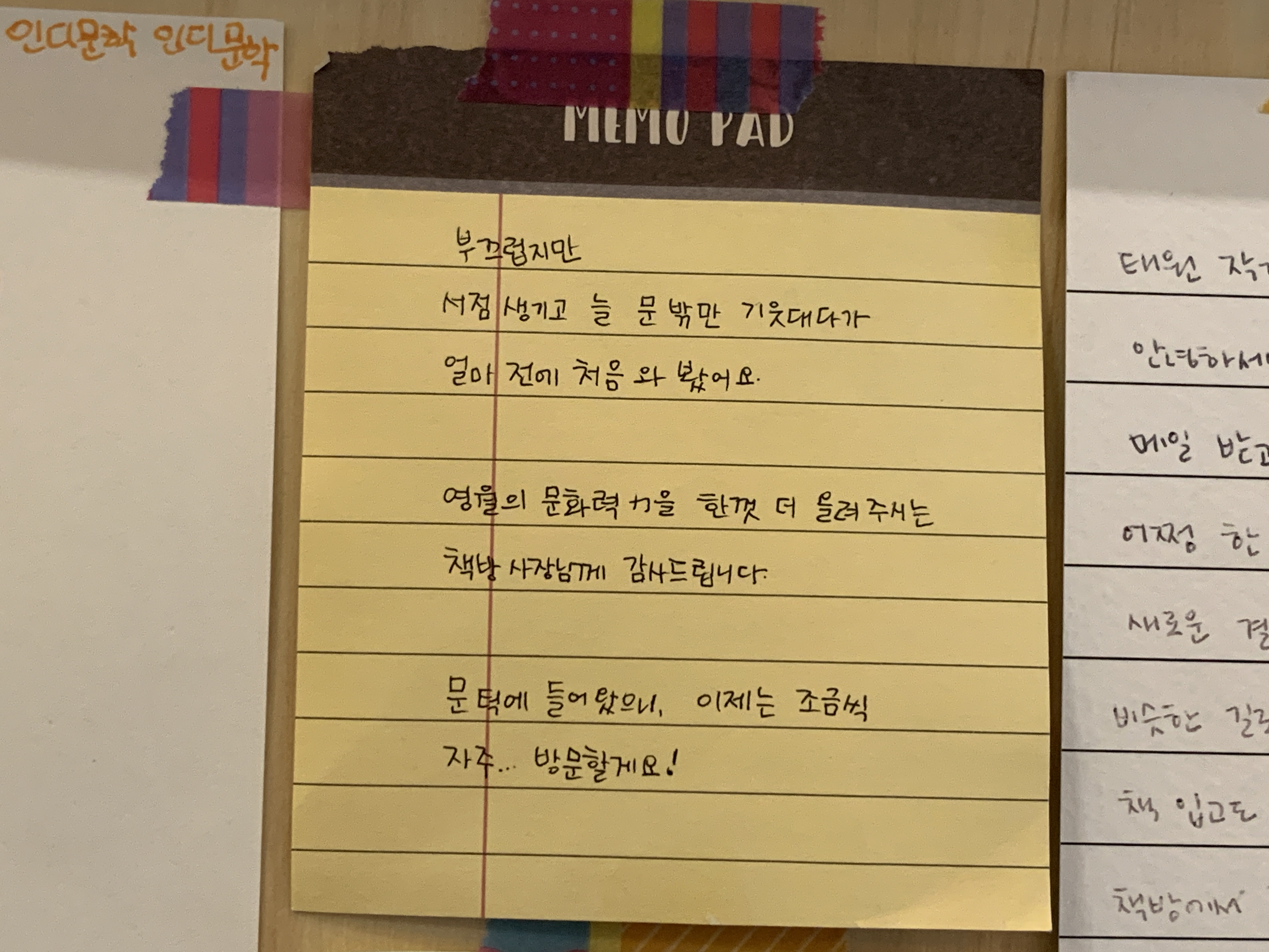 왼쪽 귀퉁이에 적어둔 ‘우리 외삼촌 가게’ 아마 주인분의 조카가 쓴 종이인가 보다. 너무 귀엽고 마음이 따뜻해졌다. :) ‘이 서점 매일 와주세요’라는 귀여운 문장. 우리 동네에 있었으면 정말 매일 왔을 텐데. 아쉽다.