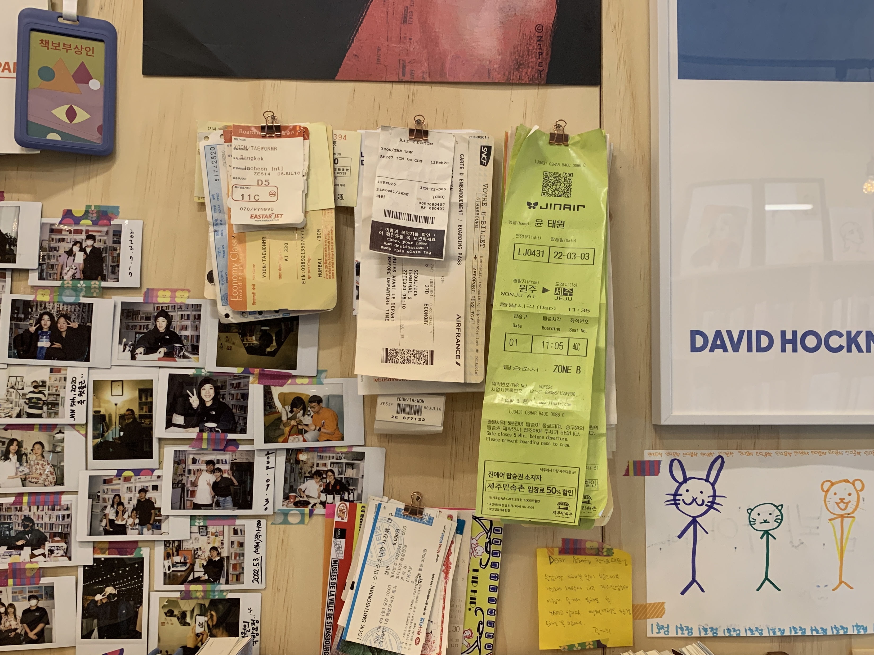 책방주인분이 여행을 자주 다니시나 보다. 항공편 티켓이 가득 벽면에 붙여져 있었다. 러프하게 붙여져 있는데 뭔가 좋아 보였달까.